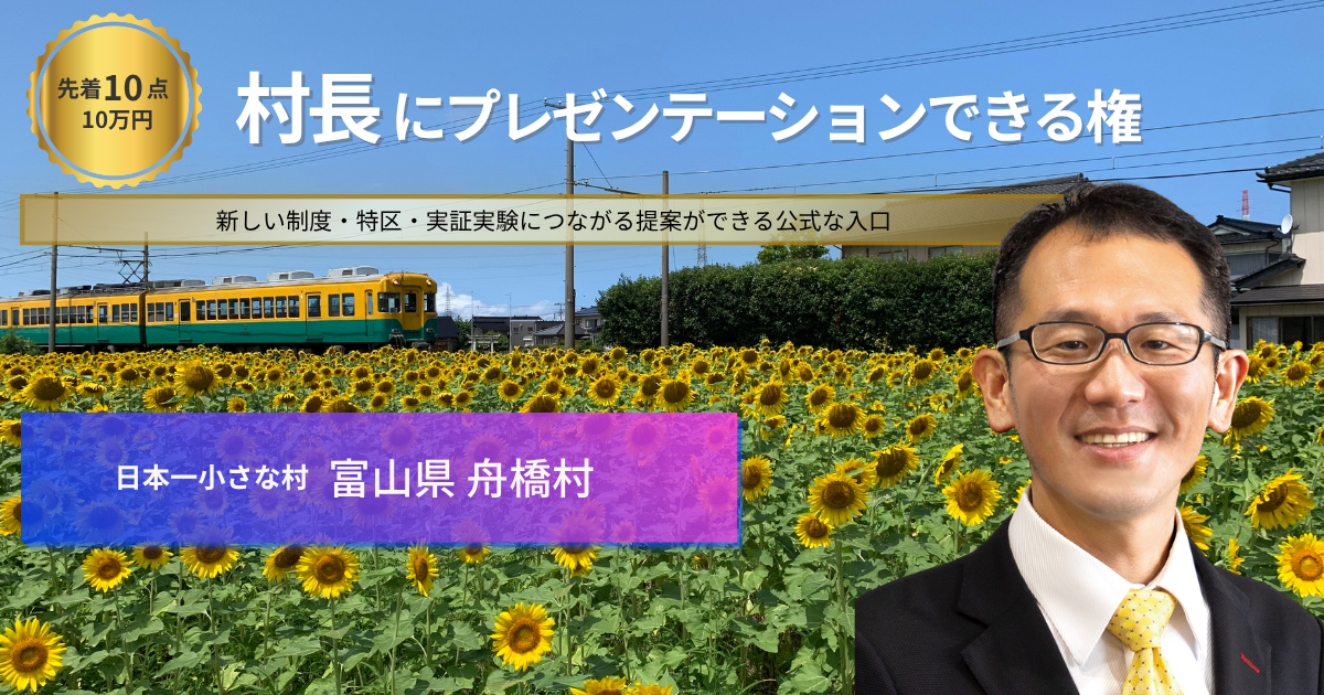 【富山初の挑戦を、村長へ直接提案】村長に1時間プレゼンテーションできる権を30日9時より販売開始—制度・実証・特区的な挑戦につながる“公式な窓口”をTOKKENで提供(富山県舟橋村)