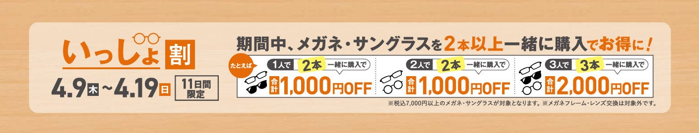 期間中、メガネ・サングラスを2本以上一緒にご購入いただくと、購入本数に応じた特典が受けられます。