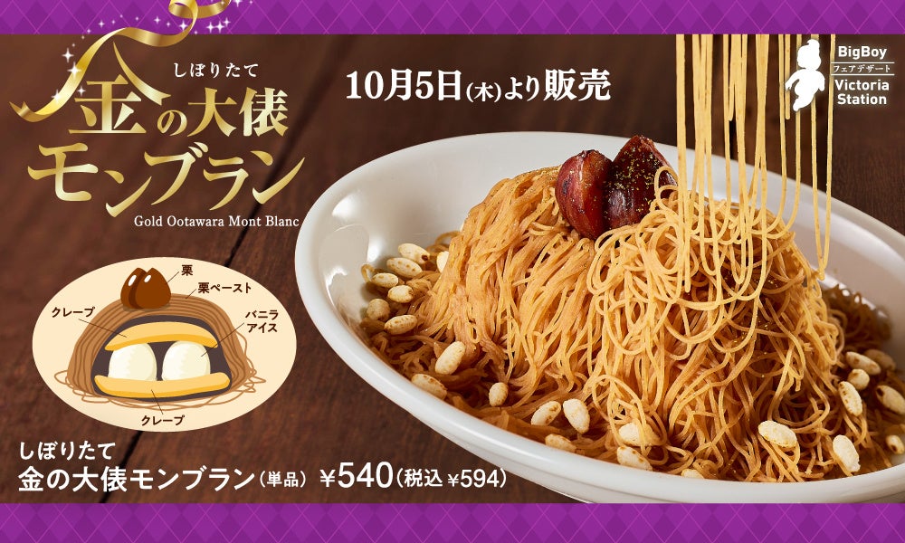 ぜひこの機会に、お近くの「ビッグボーイ」「ヴィクトリアステーション」で、「しぼりたて 金の大俵モンブラン」をお楽しみください。