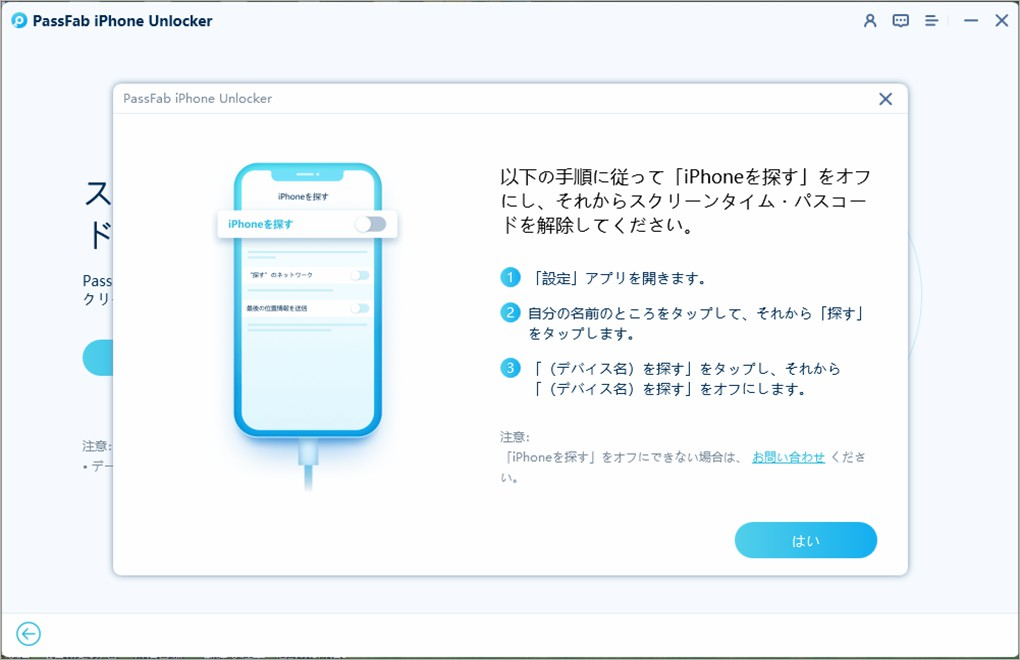 Step5:iPhone/iPadの「探す」がオンの場合は画面のガイドを見ながらオフにするよう指示されます。