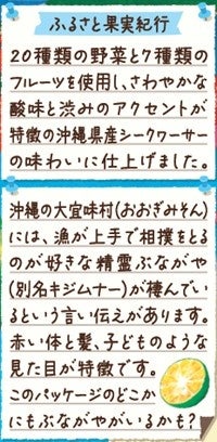 パッケージデザインの一部にイラストを使用しながら、各地域で愛されているランドマークや文化を表現しています。本品では、背景に沖縄県の大宜味村の砂浜と、大宜味村に伝わる精霊ぶながやと人々の交流をデザイン。