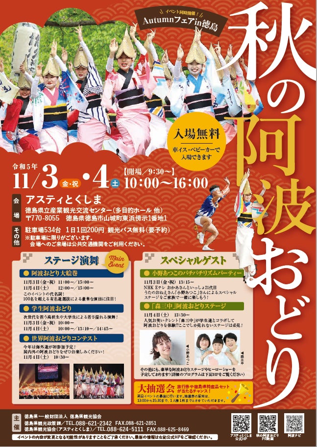 11月3日(金・祝)から5日(日)の連休期間中、徳島市中心部の各所で阿波おどりや音楽・グルメなど徳島の魅力満載のイベントが多数催される、街が一体となった秋のフェスティバル「Autumn フェア in 徳島」が開催されます。