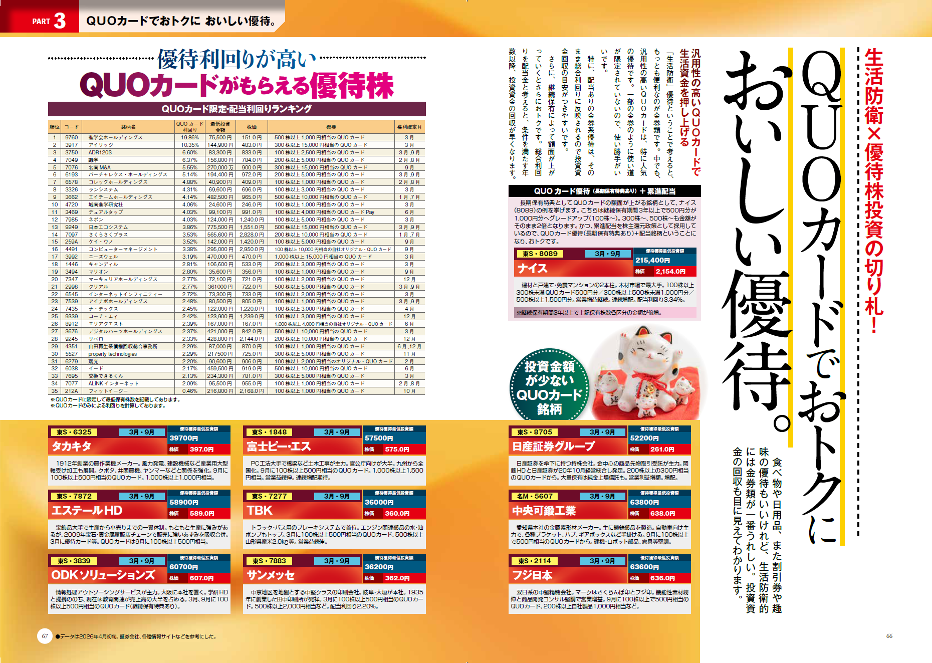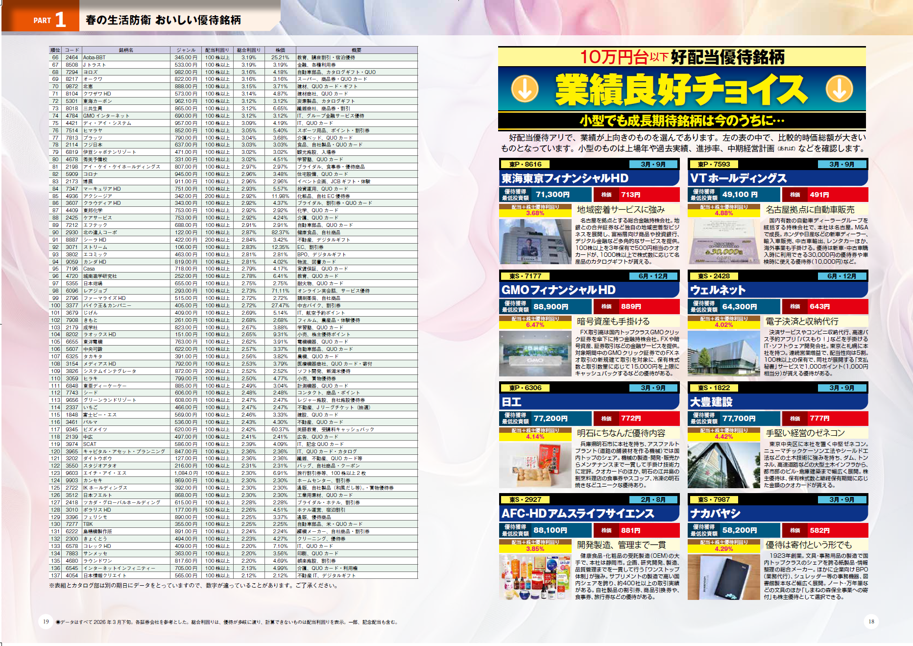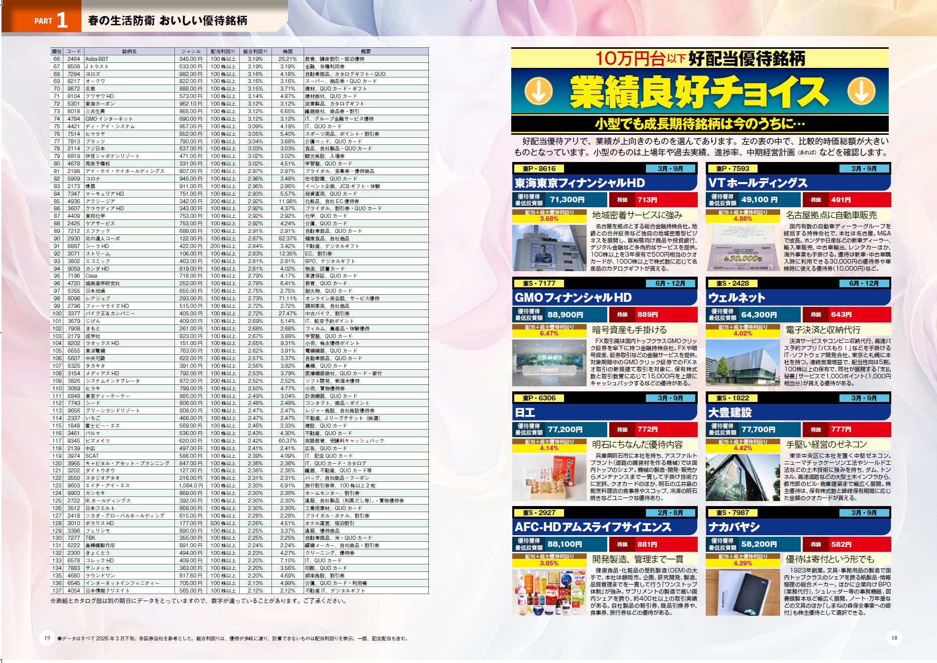 巻頭は「春の生活防衛 おいしい優待銘柄 267 銘柄ランキング付き!!」。QOLを目指して生活コスト改善&おいしい銘柄を網羅。総合利回りもわかるので、各銘柄の優待のおトク度も一目瞭然です。ポイント投資や隠れ優待まで網羅しています。