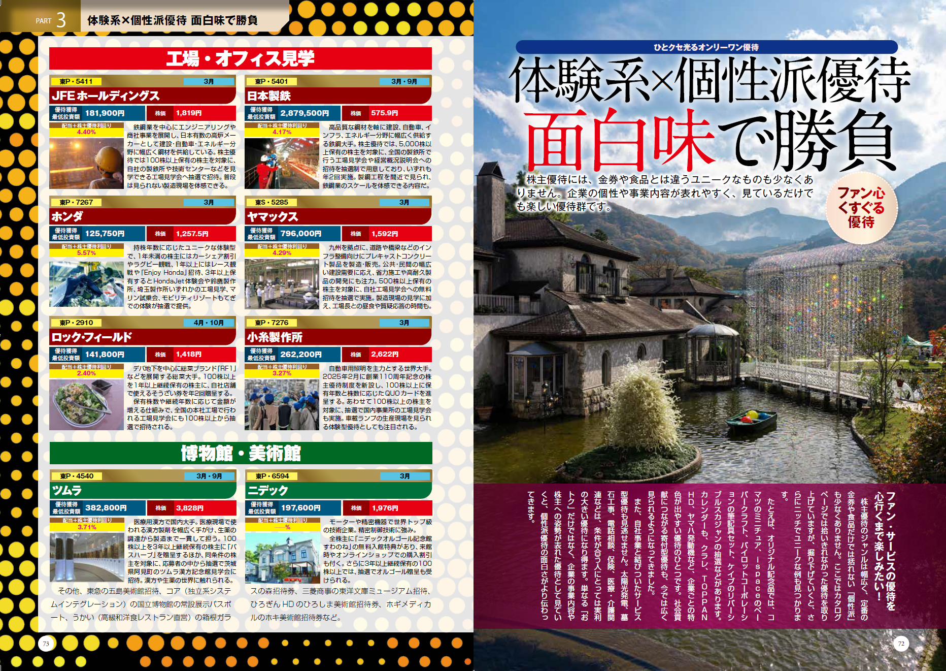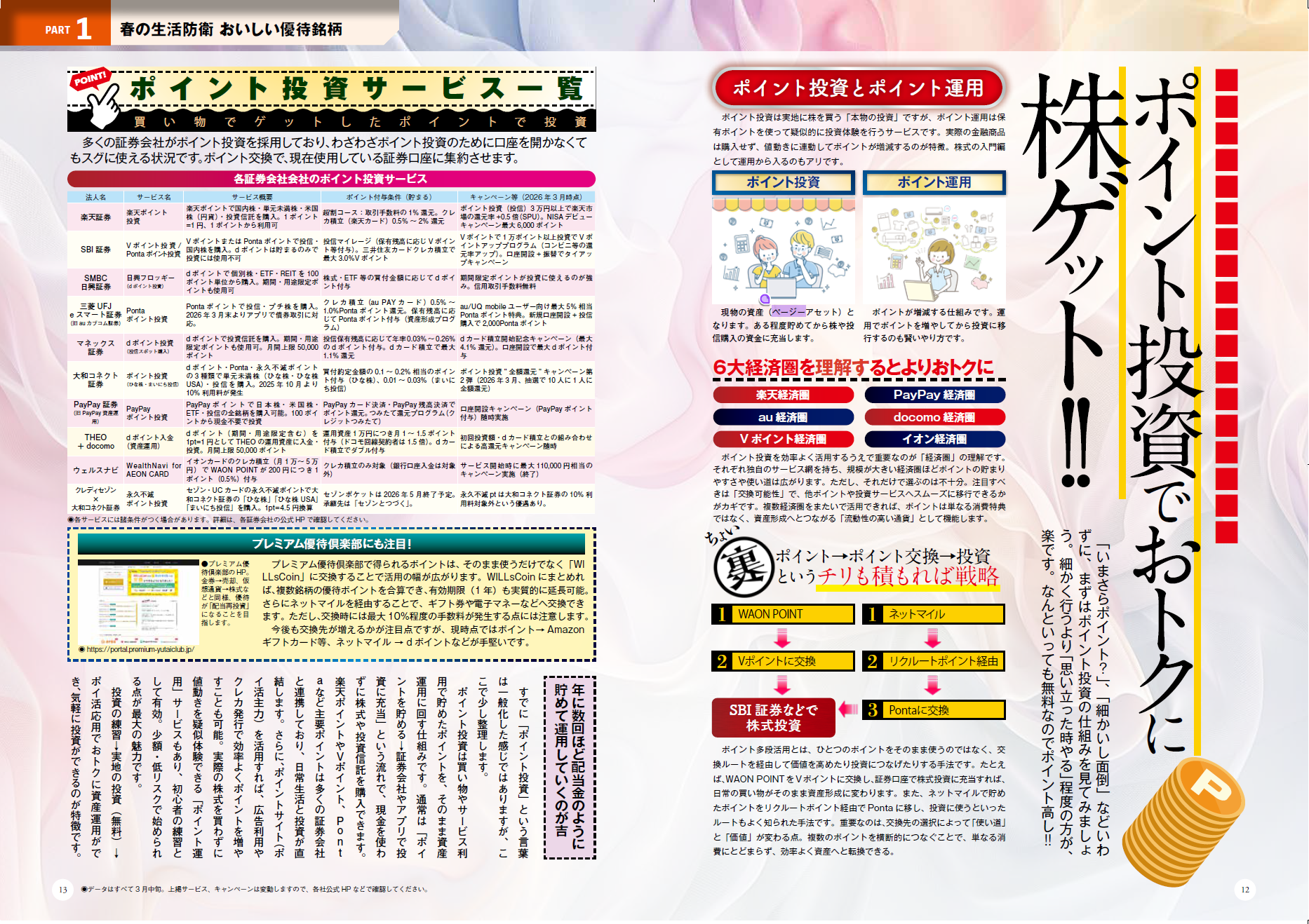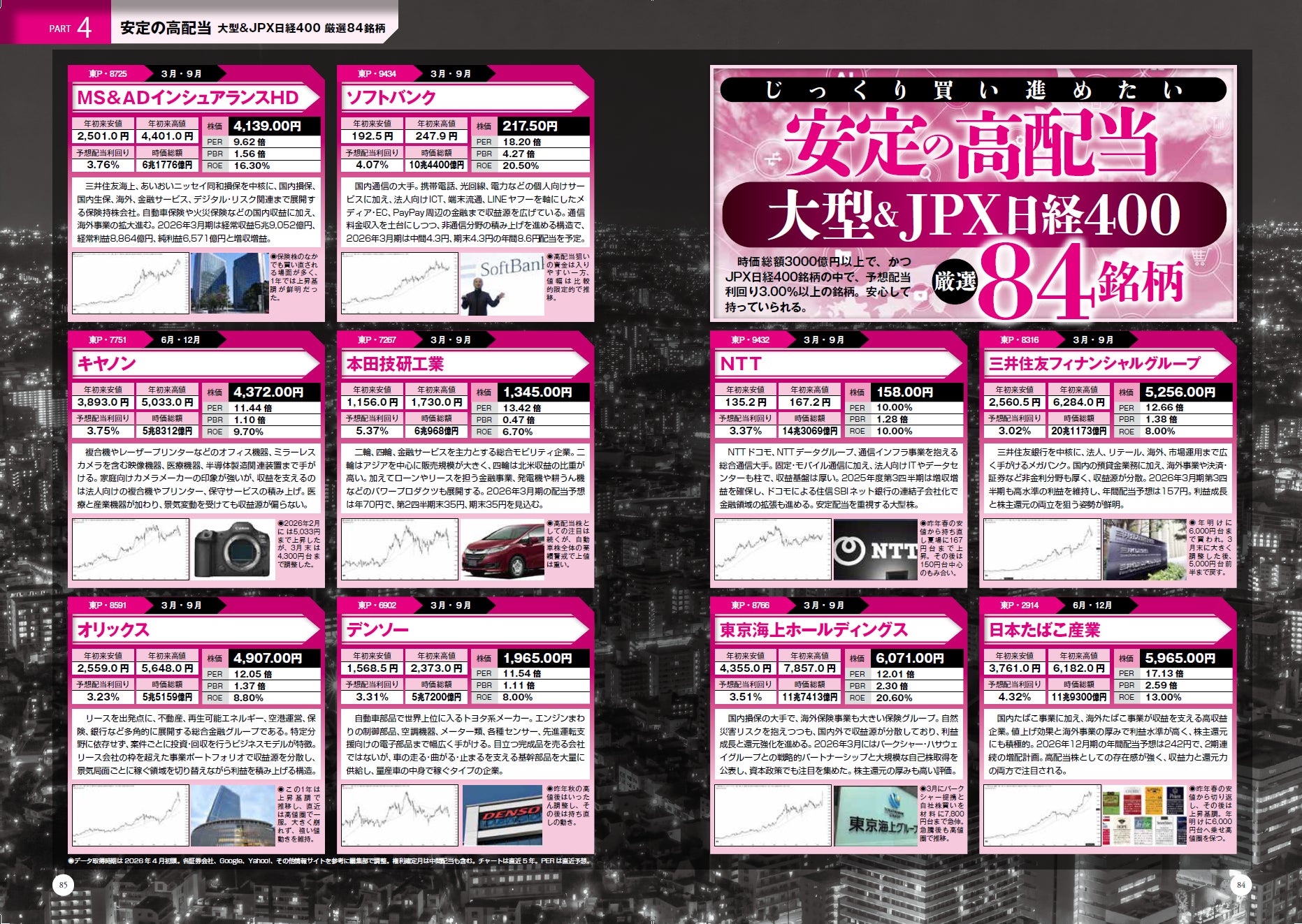 巻頭は「春の生活防衛 おいしい優待銘柄 267 銘柄ランキング付き!!」。QOLを目指して生活コスト改善&おいしい銘柄を網羅。総合利回りもわかるので、各銘柄の優待のおトク度も一目瞭然です。ポイント投資や隠れ優待まで網羅しています。