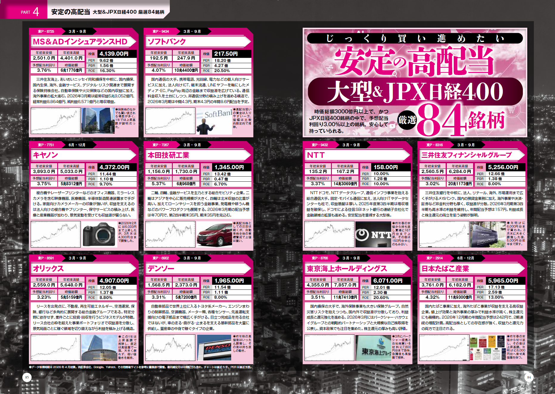 「安定の高配当」と銘打ち、大型&JPX日経400を厳選84銘柄を選びました。準高配当の大型株も網羅してありますので、有名どこはほとんどすべて押さえられます。また、J-REITランキングも付記し、国策銘柄の高配当/準高配当銘柄にも目をくばっていますので、成長銘柄の中の配当株を見つけることができます。