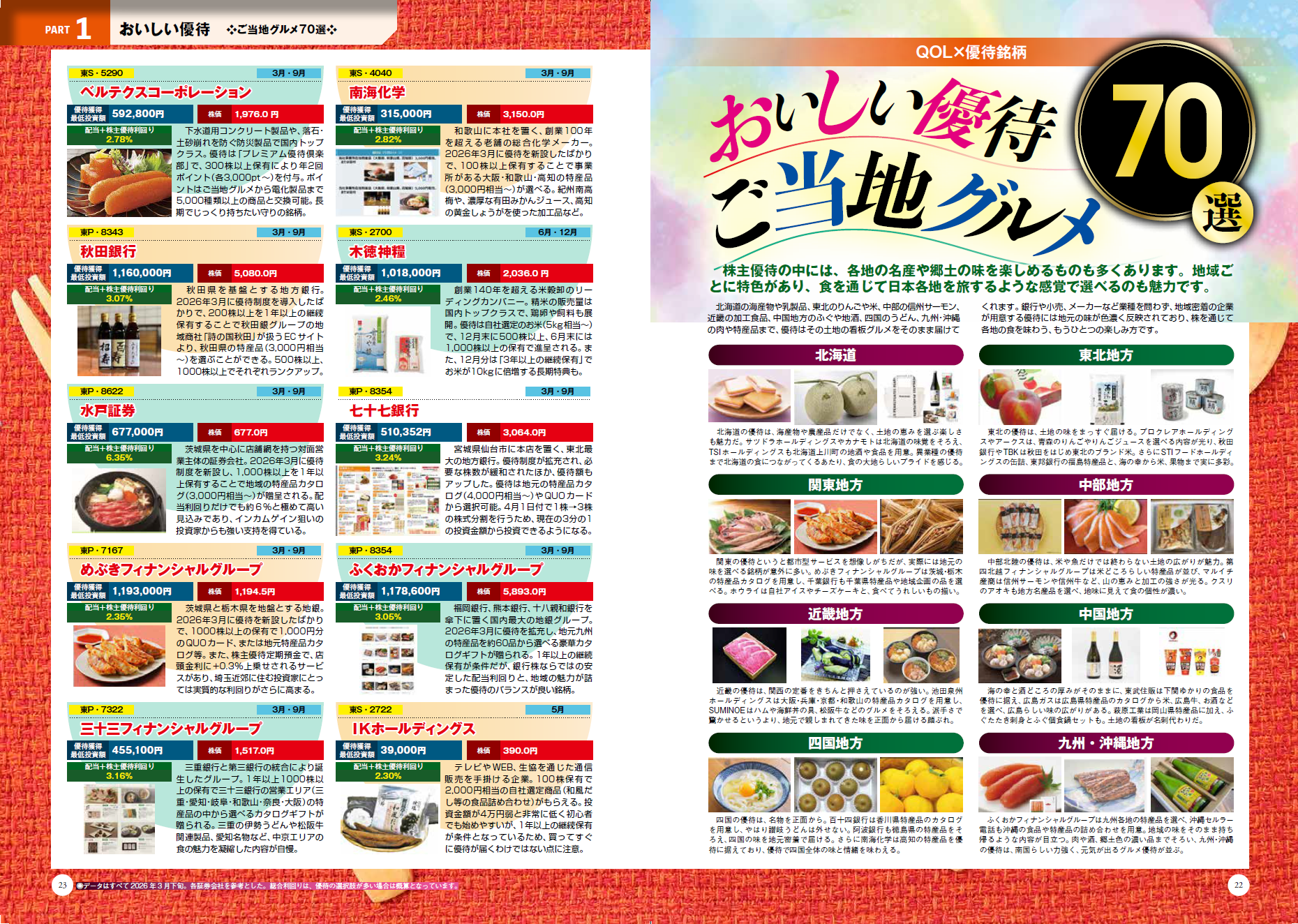 QOLを上げるひとつの方法として、「ご当地グルメ」をご提案。地方特産品がもらえる優待株を70銘柄選びました。よりどりみどりの特産品を楽しみに待ちましょう!!