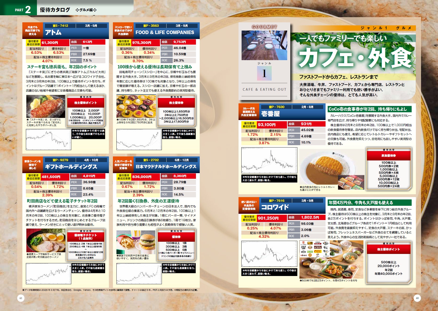 本編の優待カタログでは、グルメ編、遊びとお出かけ編、暮らしとお金編とジャンル分けし、それぞれ代表的な銘柄をチョイスしました。銘柄選びに役立ててください。