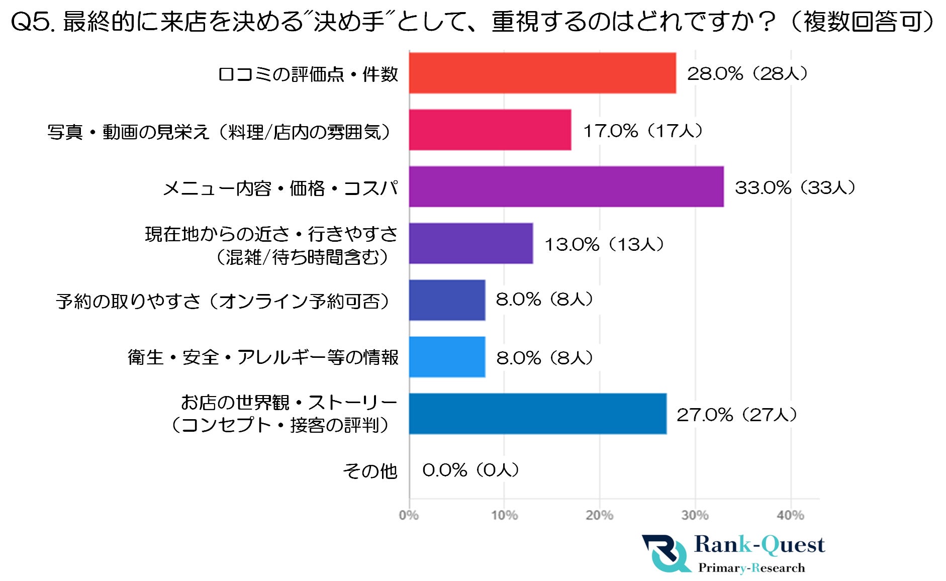 「お店の世界観・ストーリー(コンセプト・接客の評判)」も27.0%(27人)と高く、単なる食事以上に“体験”を重視する価値観が広がっている点が印象的です。
