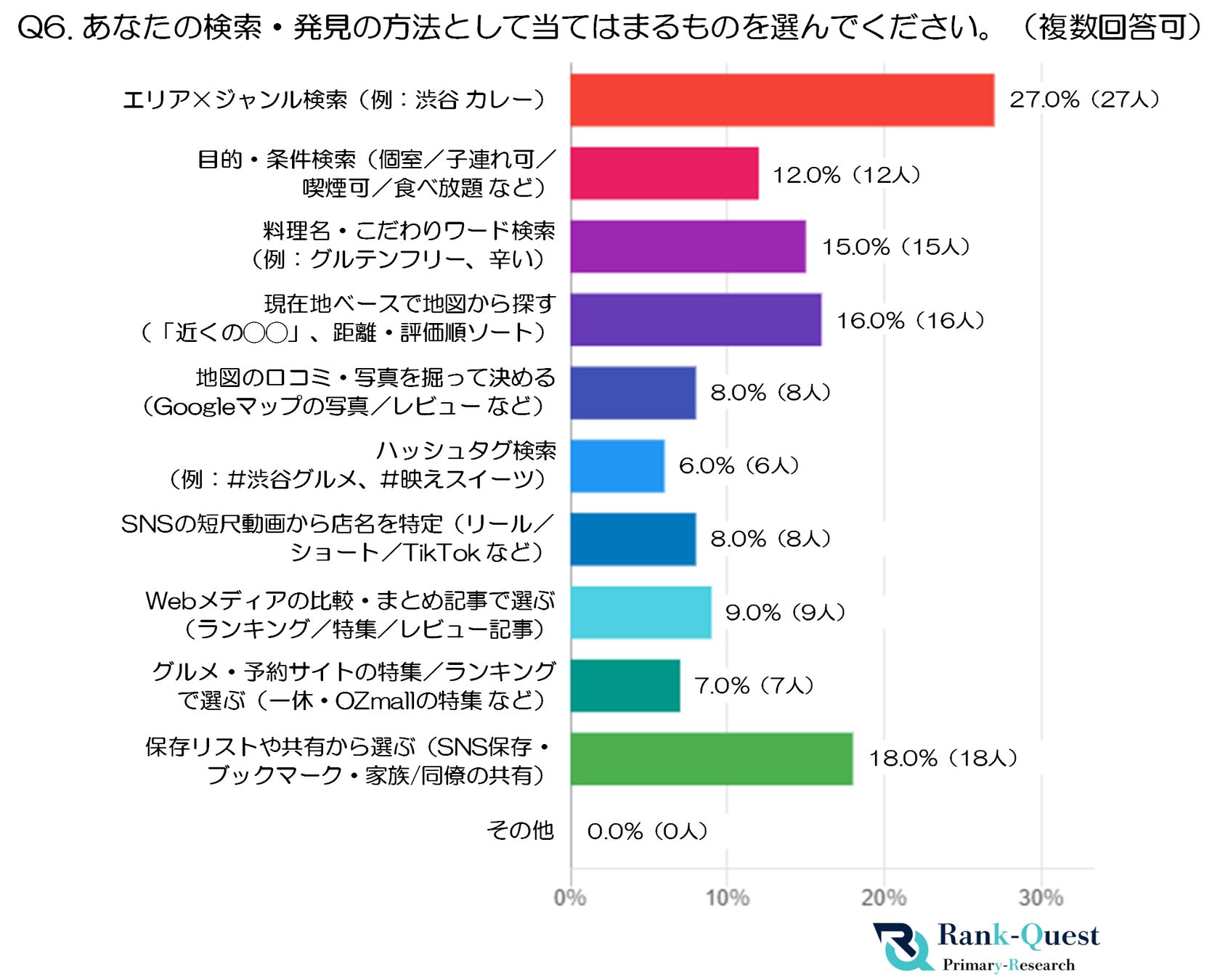 最も多かったのは「エリア×ジャンル検索(例:渋谷 カレー)」で27.0%(27人)でした。行きたい地域と食べたい料理を組み合わせたシンプルな検索方法が主流であり、効率よく候補を絞り込める利便性が支持されていることがうかがえます。