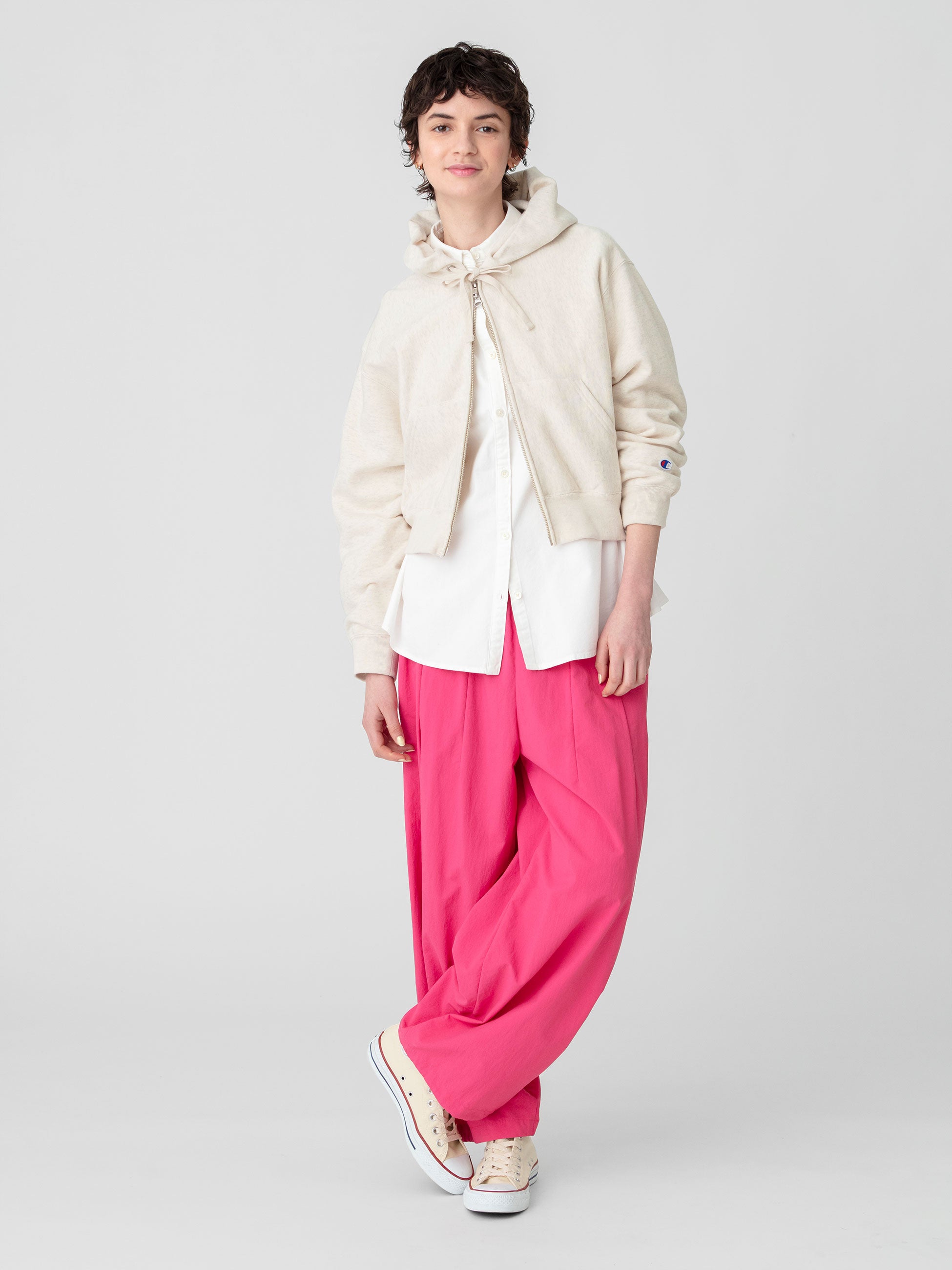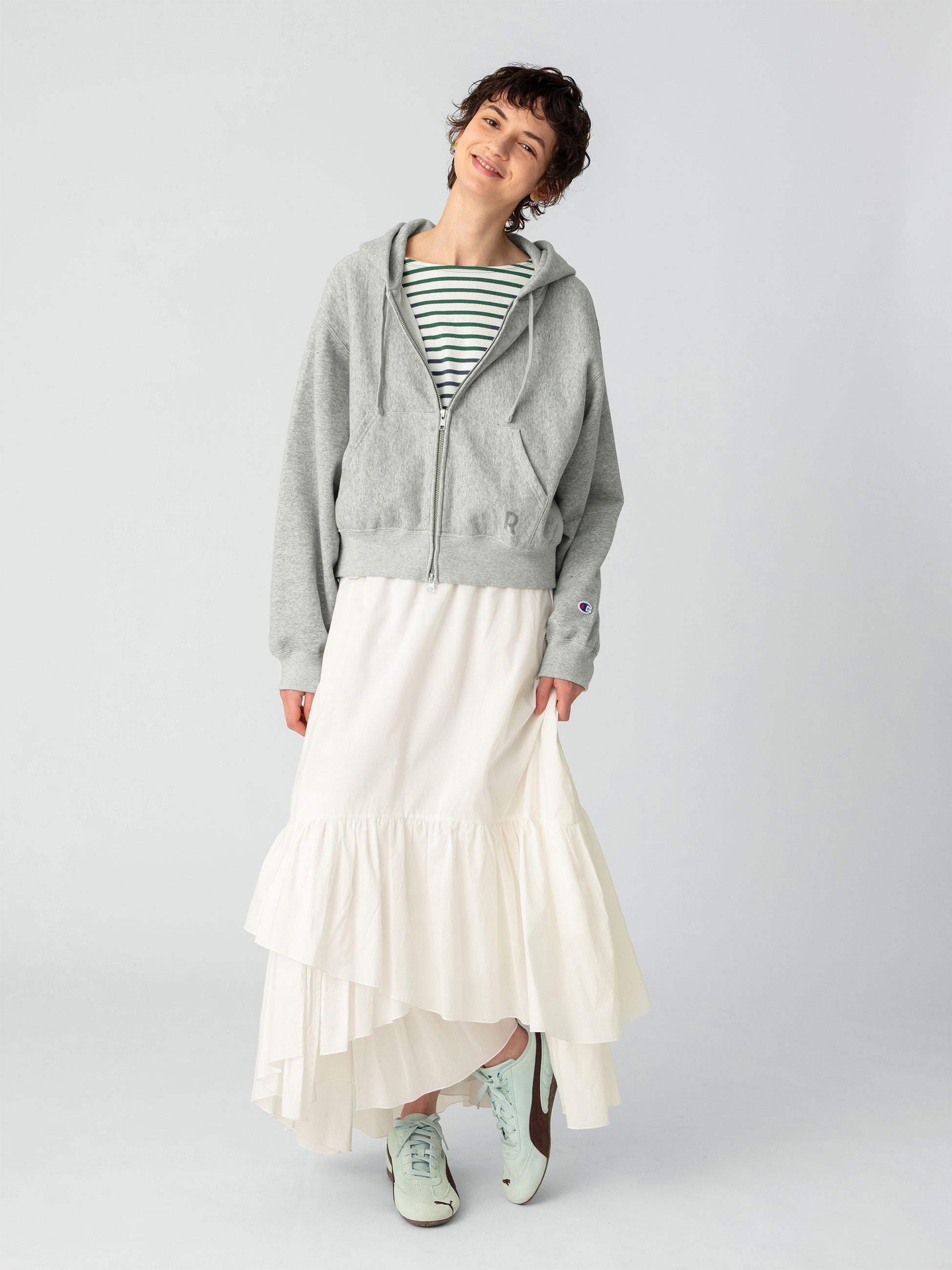 タフさとデザイン性を兼ね備えたChampion for RHCの特別なダブルジップフーディは、シンプルなデザインだからこそ「私らしい」さまざまなスタイリングを楽しめます 。