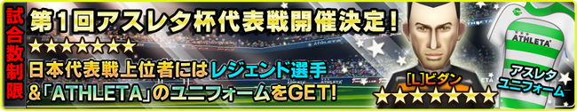イベント期間中しか購入できない限定ユニフォームや、限定エンブレムのプレゼント、『アスレタ杯』代表戦の開催など、イベント期間中しか楽しむことができない企画が盛りだくさんとなっております。