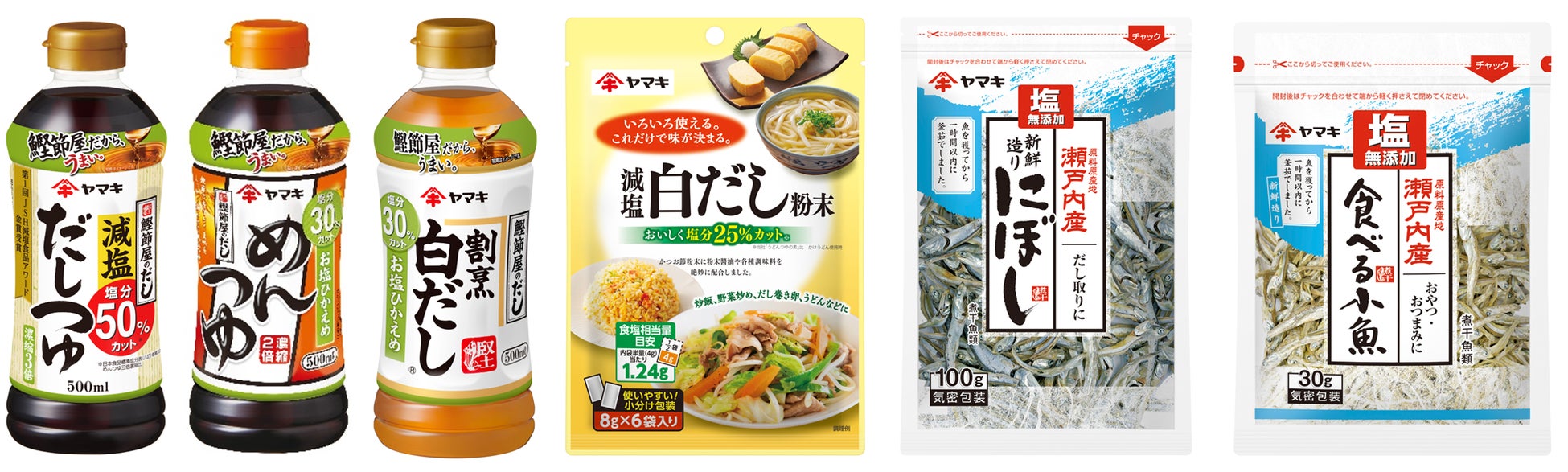 左から:減塩だしつゆ500ml、お塩ひかえめめんつゆ500ml、割烹白だしお塩ひかえめ500ml、減塩白だし粉末8g×6P、塩無添加新鮮造り煮干100g、塩無添加瀬戸内産食べる小魚30g