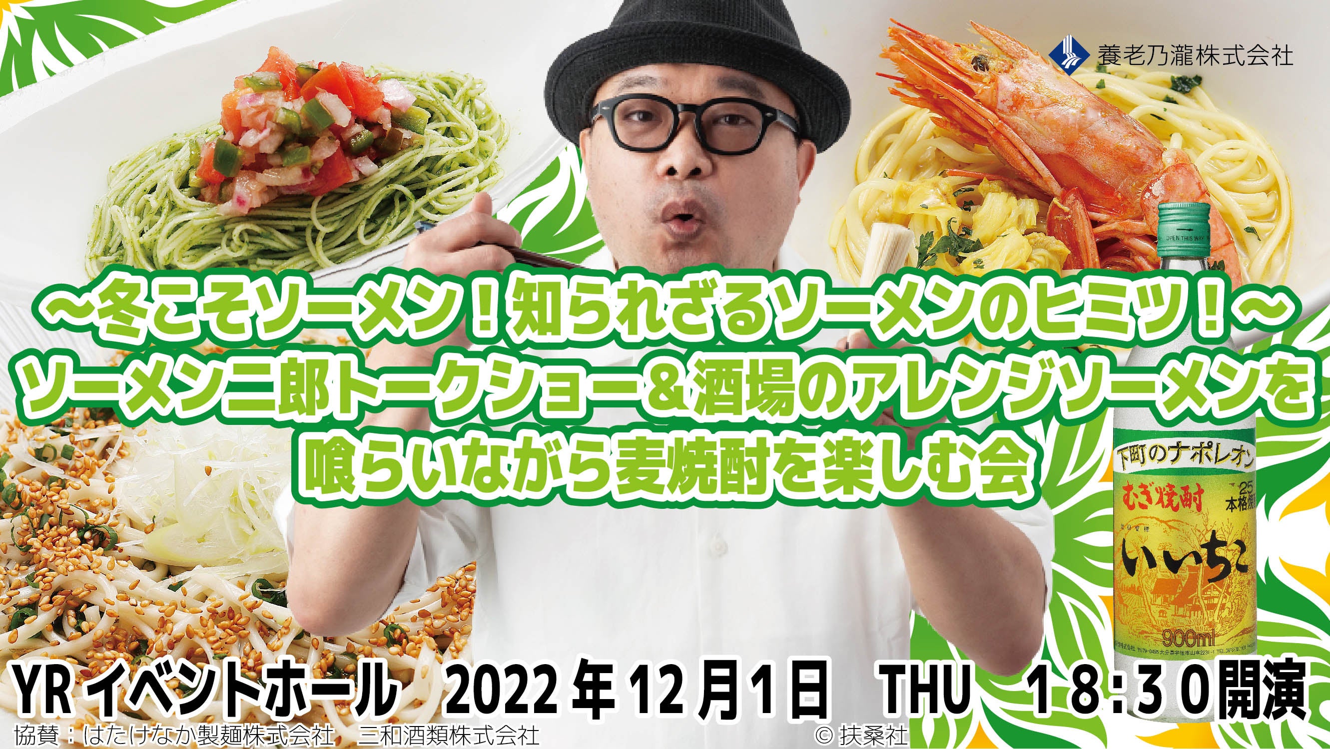 養老乃瀧株式会社(東京都豊島区、代表取締役 矢満田 敏之)は、YRイベントホール(東京都豊島区)において2022年12月1日(木)に、そうめん研究家として知られる”ソーメン二郎”さんと冬こそおいしくソーメンを召し上がっていただくため、酒場のアレンジソーメンと共に同じ麦を原料とする麦焼酎で楽しんで頂くイベントを開催いたします。