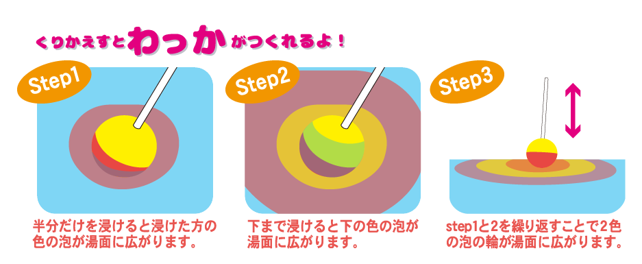 これをお風呂に入れて遊んでいきましょう!はじめに、半分だけ浸けた方の色の泡が湯面にじわ〜と溶けて広がります。続いて、下まで浸けると下の色の泡が湯面に広がっていきます。