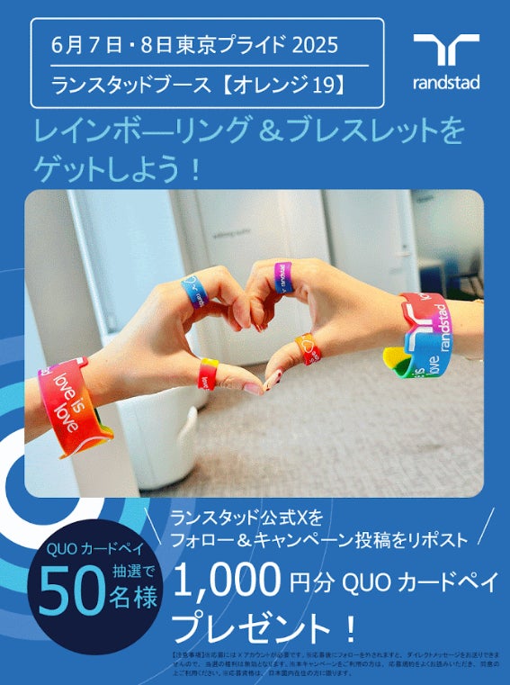 総合人材サービスを提供するランスタッド株式会社(本社:東京都千代田区 代表取締役社長 猿谷哲)は、6月7日(土)・8日(日)に代々木公園で開催されるアジア最大級のLGBTQI+*²関連イベント 「東京プライド2025*³」へのブース出展を記念して、6月1日(日)から9日(月)まで公式SNSアカウントでQUOカードペイが当たるキャンペーンを開催いたします。