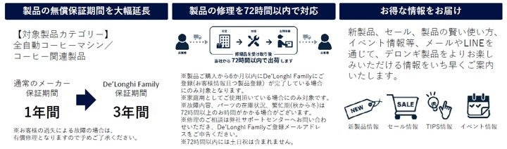 デロンギ製品をご購入いただいたお客様に、安心して製品を長くご愛用いただくため、ご購入後のメーカー無償保証期間の延長、万が一の際の迅速な修理対応といったアフターケアを大幅に拡大し提供いたします。