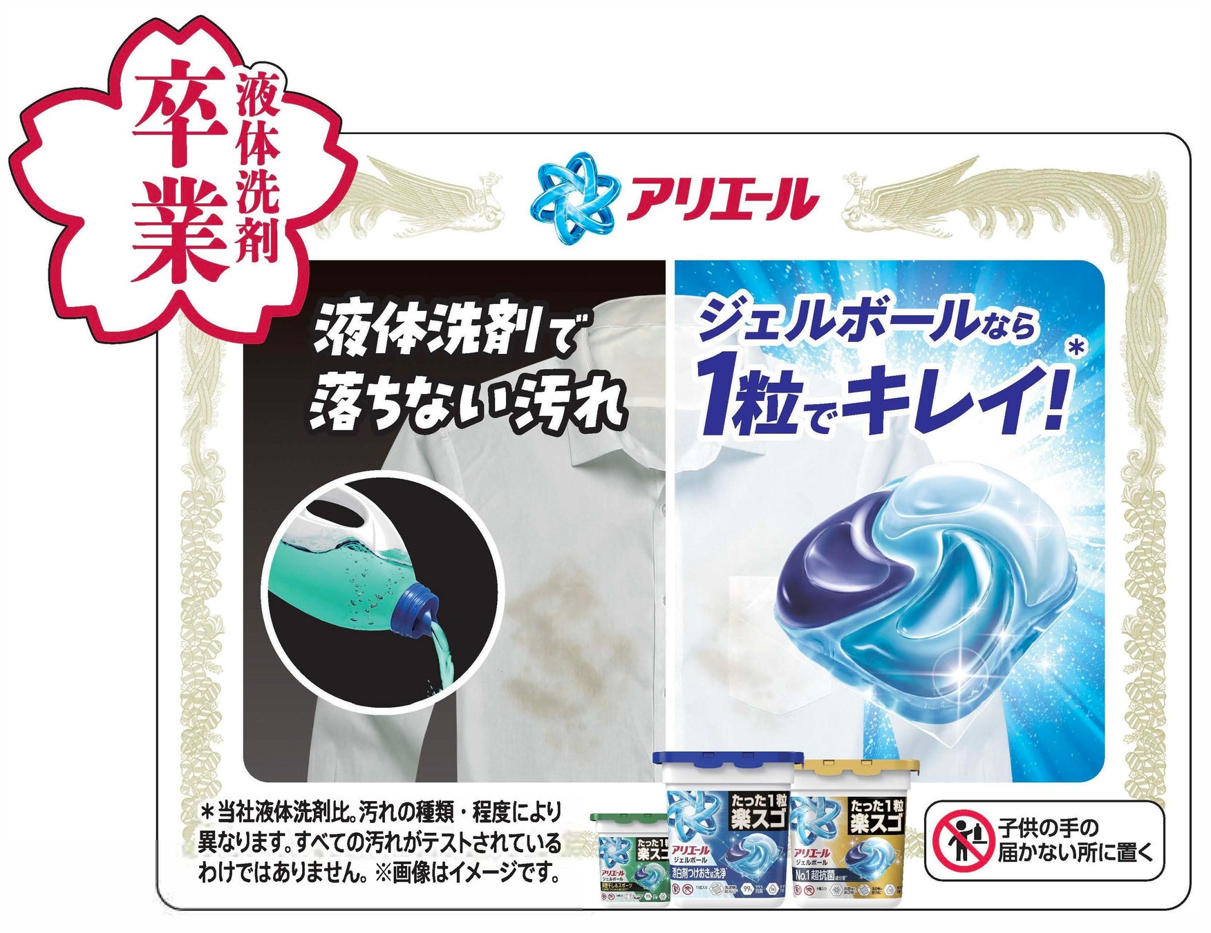 *1 当社液体洗剤比。汚れの種類・程度により異なります。すべての汚れがテストされているわけではありません。「アリエールジェルボールプロ」「アリエール ジェルボール プロパワー」のみ。