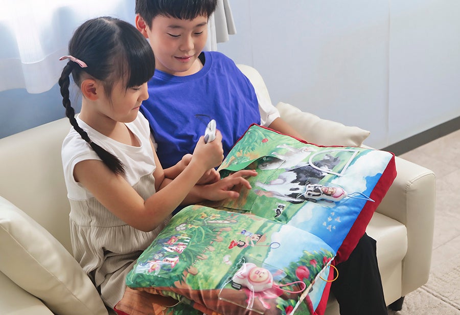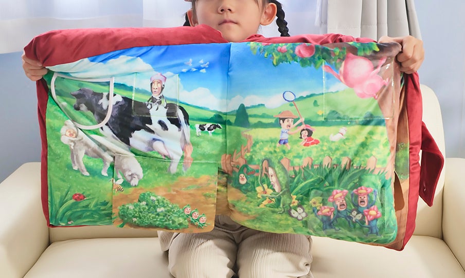 『こびとづかん もっちぃもっちぃBook』 は、その「こびとづかん」シリーズの作品の中からイラストをセレクトしたブック型の“布製ビッグ絵本”です。縦38cm、横30cm、見開き幅は約66cmと大人でも抱えるぐらいのボリュームあるサイズとなっており、「Mocchi-Mocchi-(もっちぃもっちぃ)」シリーズならではのふわふわな肌触りの布地を使用しているため、クッションとしても、開けば“ビッグ絵本”としても楽しめる商品です。