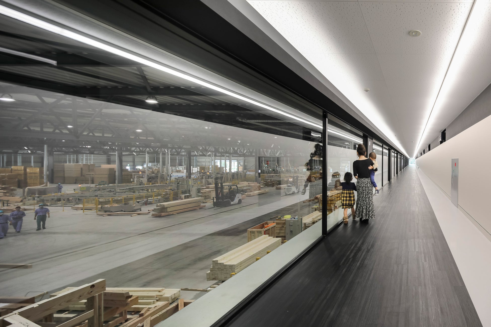 「プレカット事業部 茨城工場」は、伝統的な木造建築の手法と現代的なデザインを融合し、木材加工工程を分かりやすく見せる設計となっています。浮遊するガラス張りの通路からは、間近で製造工程を見学することができ、また、事務所棟には一般流通材を使ったトラス構造を採用することで、美しさと機能性を兼ね備えています。