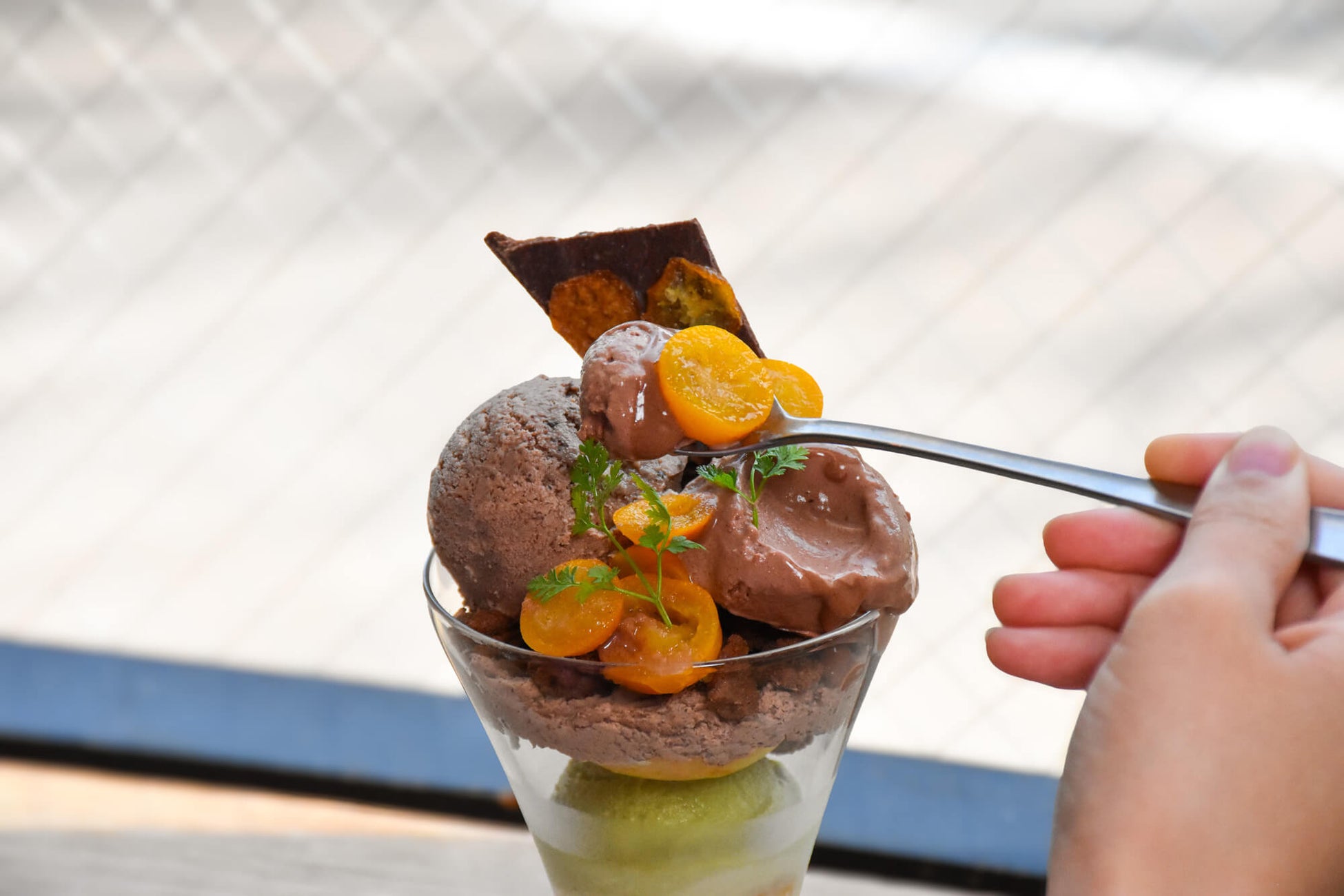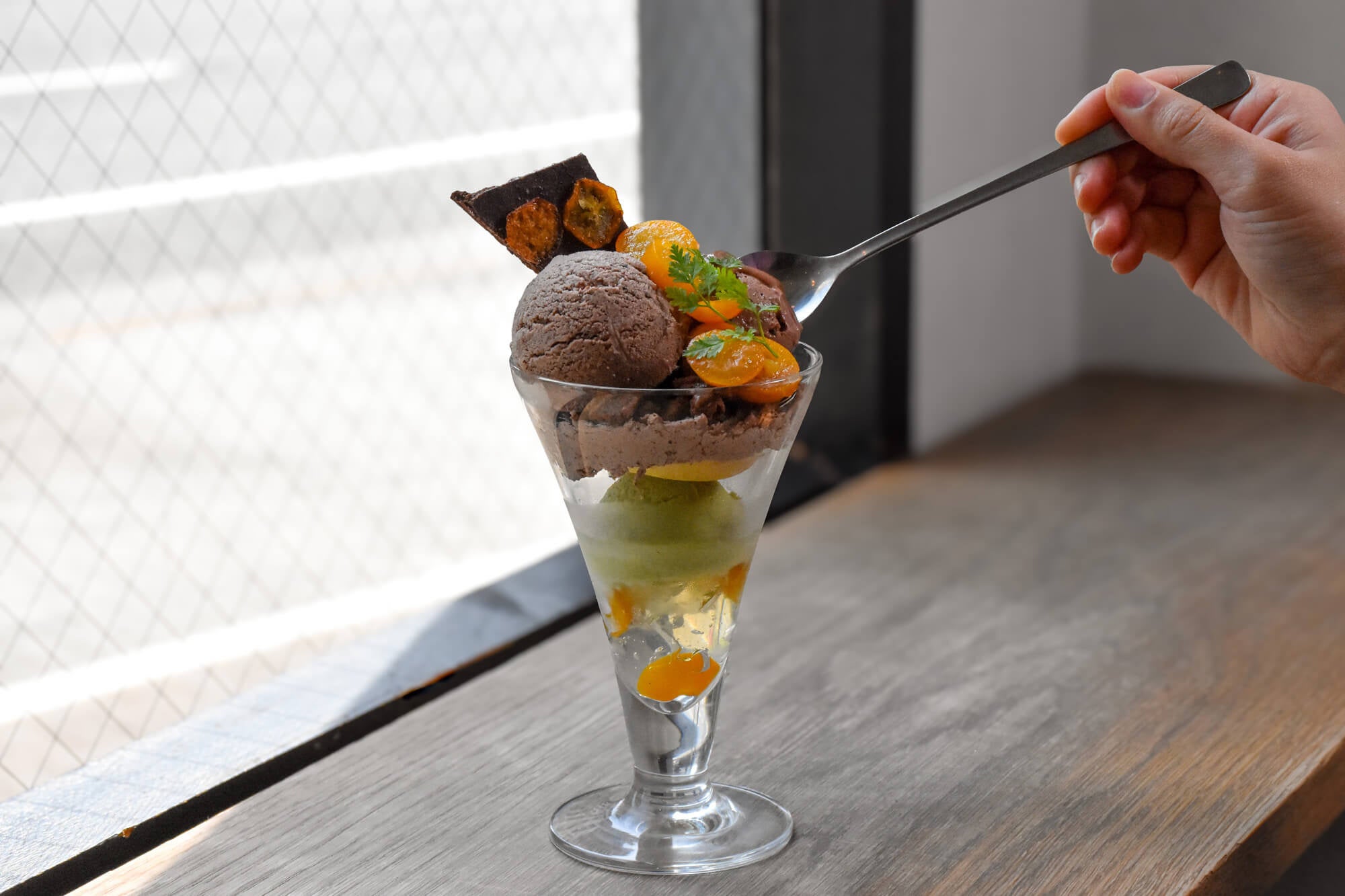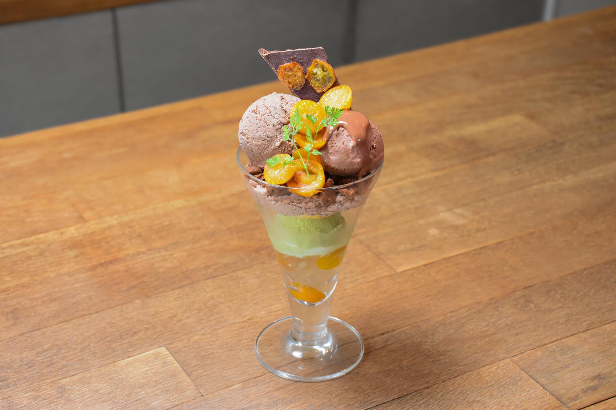 さっぱりとして軽やかな金柑のスフレアイスから、鮮やかな茶葉の青みが楽しめる緑茶チョコレートのアイスなど、爽やかにパフェを締めくくります。