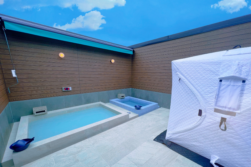 全客室に設置された専用の露天風呂にテントサウナ、そして天然水の水風呂。