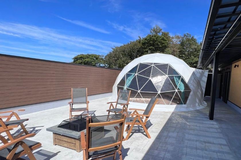 各室をそれぞれ敷居で囲い、プライベート性を重視したスペースの中に独立型のドーム型テントとハウス、露天風呂、テントサウナ、富士山の天然水を使用した水風呂を各室に設置。全天候型プライベート空間を実現しています。