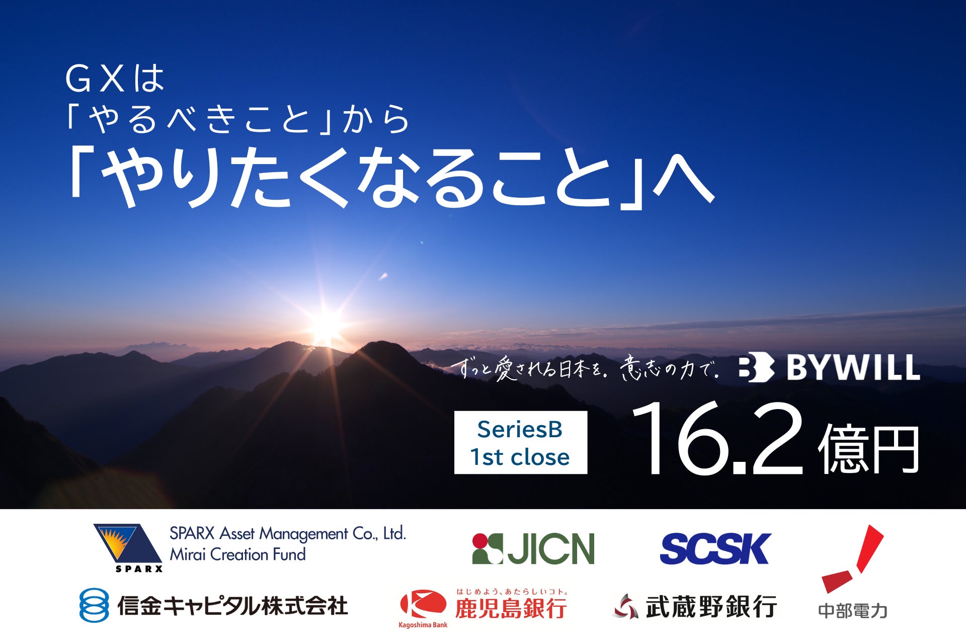株式会社バイウィル(本社:東京都中央区、代表取締役社長:下村 雄一郎、以下「バイウィル」)は、シリーズBラウンドの1stクローズとして、スパークス・アセット・マネジメント株式会社が運営する未来創生3号ファンドをリード投資家とし、株式会社脱炭素化支援機構(JICN)、SCSK株式会社、中部電力株式会社、信金キャピタル株式会社、株式会社鹿児島銀行、株式会社ぶぎんキャピタルの計7社を引受先とした第三者割当増資を通じて、総額16.2億円の資金調達を実施いたしました。