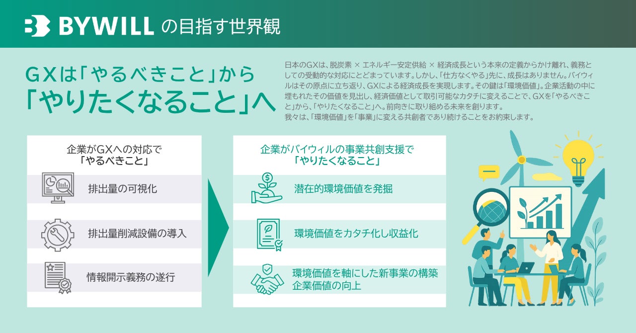 私たちバイウィルは、GXを“やりたくなる”を形にする共創者として、「環境価値を“事業”に変える」挑戦を続けています。