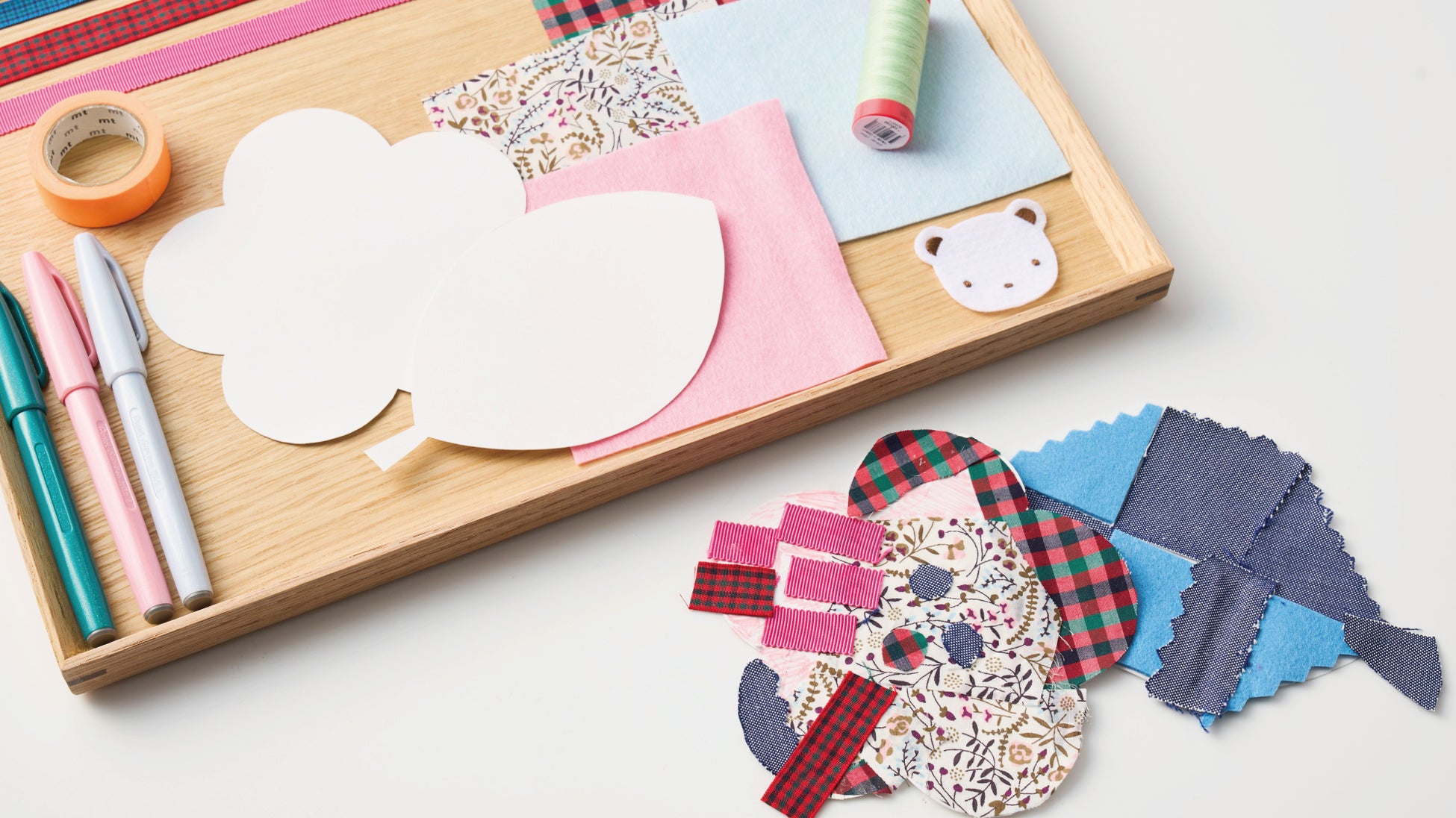 葉っぱやお花のカタチをしたシートに、自由に色を塗ったり生地を貼ったりして、アートワークをお楽しみいただけます。生地の一部は、ファミリアのお洋服を作るときに出てしまう生地の端材を使用。生地やリボンは、庭園で感じるシーズンカラーを季節ごとにご用意いたします。端材を活用したサスティナブルなアートワークをお楽しみください。できあがった作品は、思い出としてぜひお持ち帰りください。
