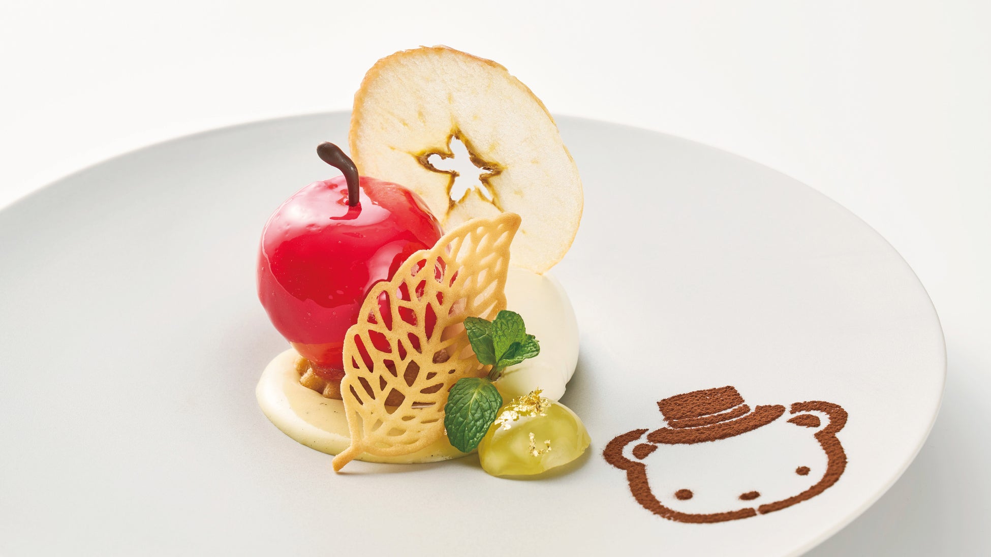 ディナータイムを締めくくるデザートは、クマちゃんが描かれたプレートに、ファミリアのお洋服のモチーフによく使われる”りんご”をテーマにしたデザートをご用意いたしました。 りんごの形を模した見た目も可愛い「りんごのムース」に、りんごそのものをシロップに漬けオーブンで乾燥焼きした「りんごのセッキ」を添えました。同じりんごを様々な形で楽しめることや、りんごを残すことなく食べられることを知っていただけるデザートです。お食事の際は、デザートの最後までフォークを使うことで、オリジナルガイドブックに記載しているテーブルマナーを実践いただけます。