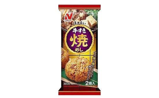 牛すき焼きのおいしさをイメージしたワンハンドサイズの具入りごはんです。具材に牛肉、たまねぎ、青ねぎを入れ、特製の甘辛いすき焼きたれをしっかりぬって、香ばしく焼き上げました。