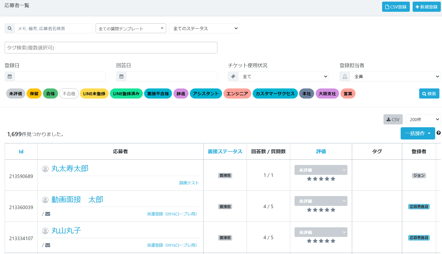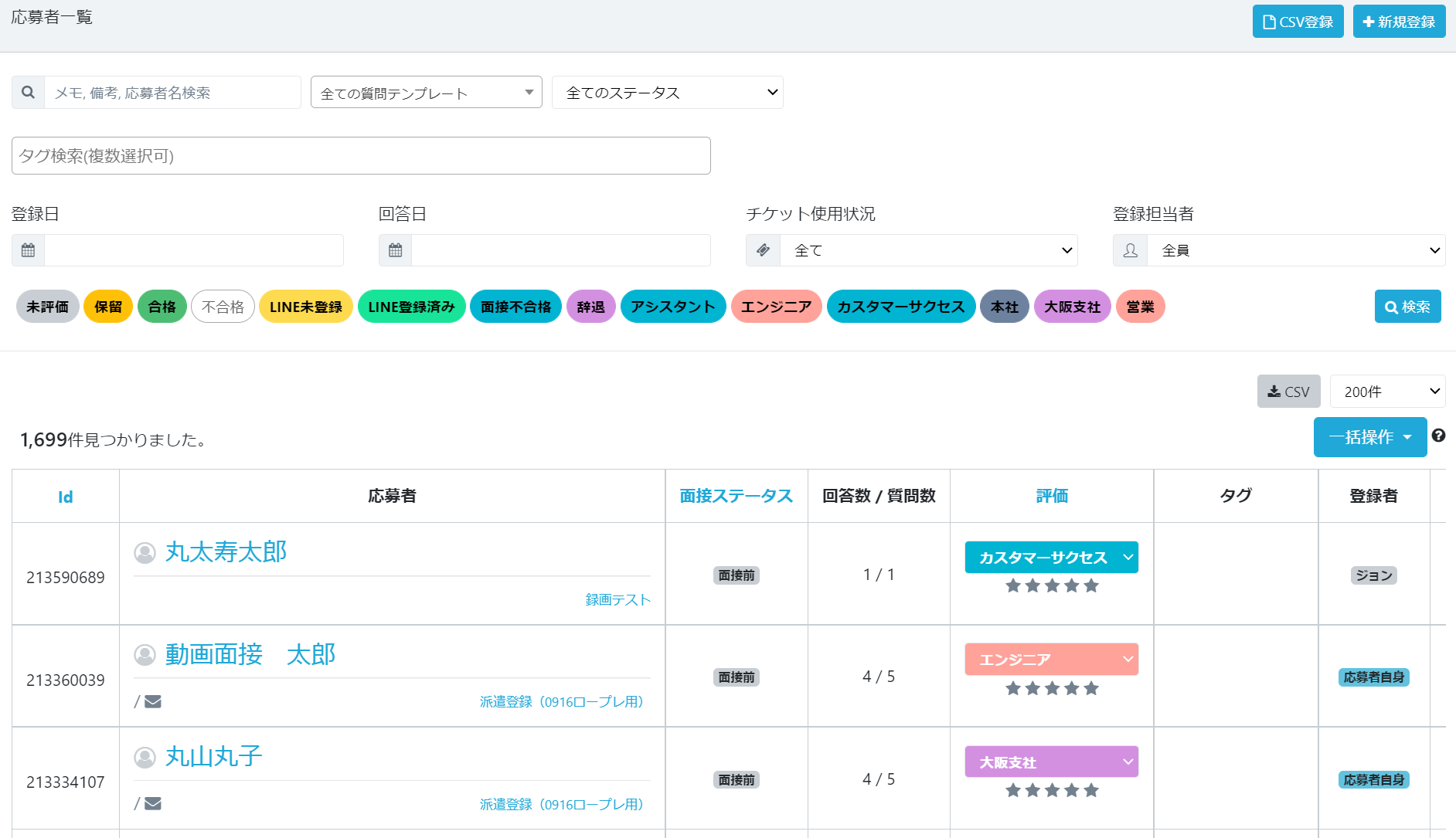 応募者に対して任意で評価(デフォルトでは未評価・保留・合格・不合格)を付けることが出来ます。 評価を付けると、該当の応募者のみを絞り込んで検索することが可能になります。