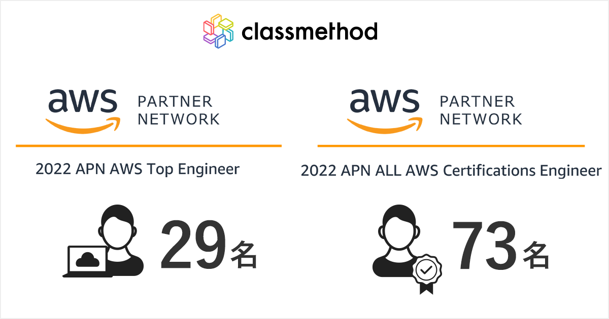 クラスメソッド株式会社(本社:東京都千代田区、代表取締役社長:横田 聡、以下「クラスメソッド」)は、2022年5月25日(水)にアマゾン ウェブ サービス ジャパン(AWSジャパン)が発表した「2022 APN AWS Top Engineers」において、所属企業別で最多となる29名が選ばれたことをお知らせします。さらにAWS認定資格のすべてを保有する「2022 APN ALL AWS Certifications Engineers」においても所属企業別最多の73名が表彰されています。