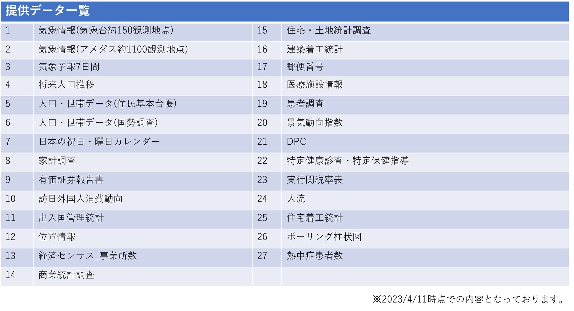 SnowflakeマーケットプレイスよりCO-ODE利用をお申込みいただくと、CO-ODEで提供している全27種類すべてのデータを利用できます。