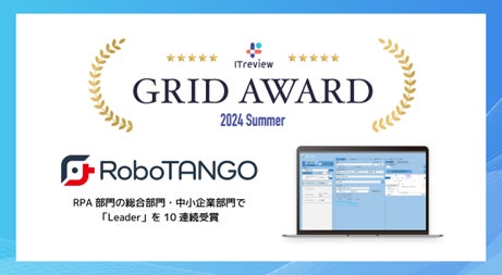 スターティアホールディングス株式会社(本社:東京都、代表取締役:本郷秀之、証券コード:3393)は、連結子会社でバックオフィスDX支援事業を手掛けるスターティアレイズ株式会社(本社:東京都、代表取締役:古川征且)が提供するRPAツール『RoboTANGO(ロボタンゴ)』が、アイティクラウド株式会社(本社:東京都、代表取締役:黒野源太)が主催するアワード「ITreview Grid Award 2024 Summer」RPAツール部門内の総合部門、中堅企業部門、中小企業部門の3部門において、満足度と認知度の双方が優れた製品であると評価され、Leaderを受賞したことをお知らせします。なお、RPAツール部門内の総合部門、中小企業部門では、今夏の受賞でLeaderを10期連続受賞となります。