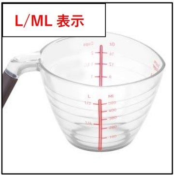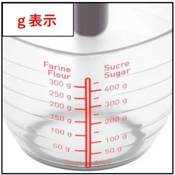 液体を計る目盛り(L、ML)と、粉を計る目盛り(g)がついているので、液体はもちろん粉を計るときも使える計量カップです。