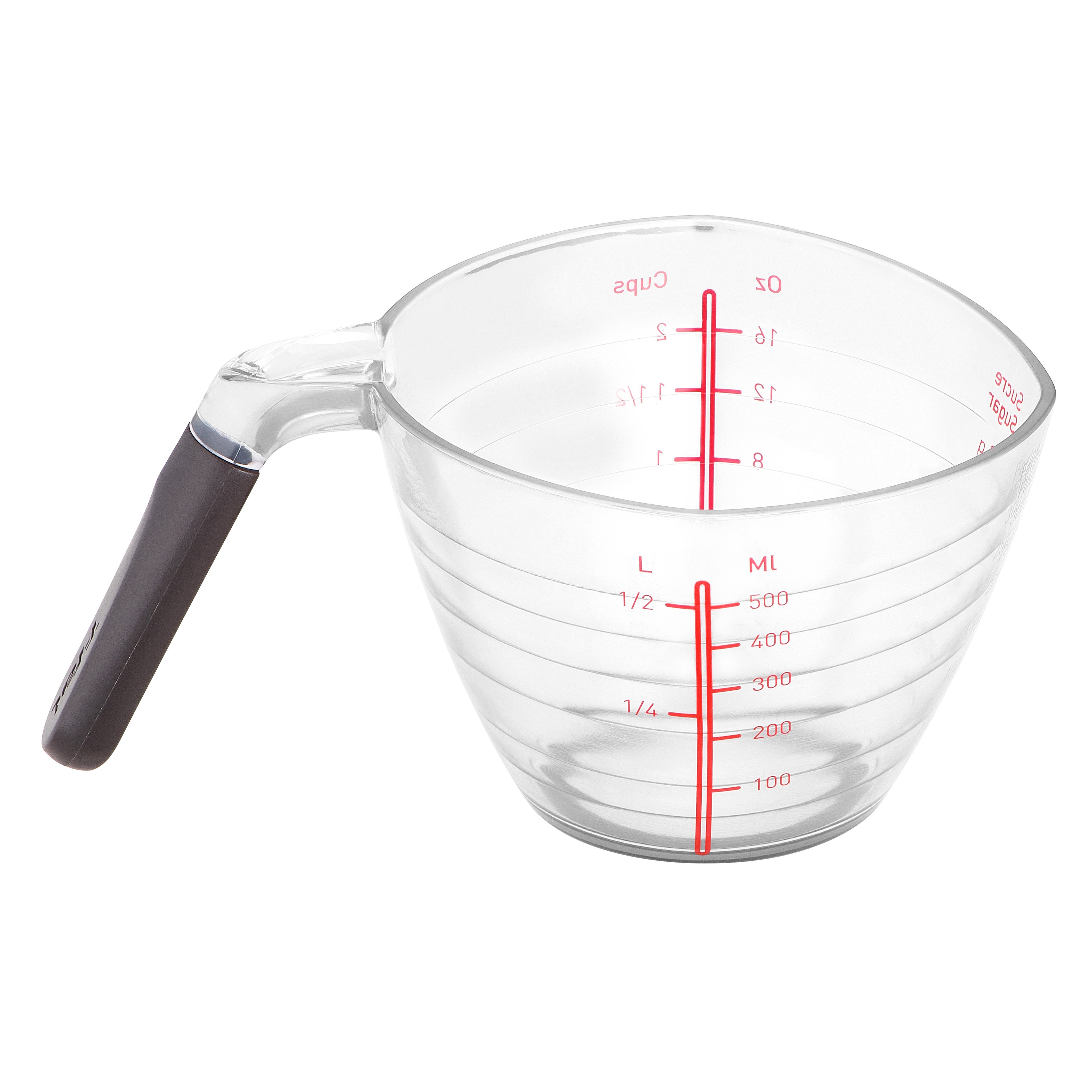 カップには液体の目盛り(L、ML)と、粉の目盛り(g)がついているので、液体はもちろん粉を計るときも使える便利な計量カップです。さらに、3方向から注げる注ぎ口付きで、正面はもちろんのこと、右からでも左からでも注ぎやすく、液だれもしにくくなっています。底には滑り止めストッパーが付いて、キッチンの調理台で安定して計量ができます。500mlのたっぷりサイズで、計量した材料を中でそのまま混ぜることもできる、使い勝手の良い計量カップです。