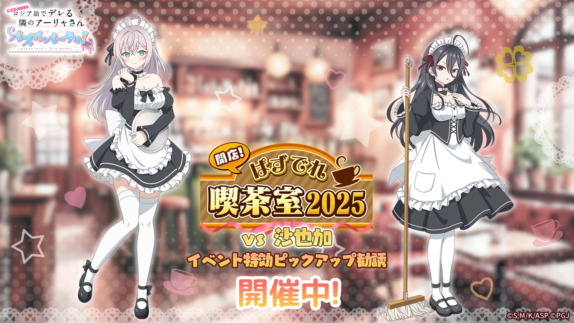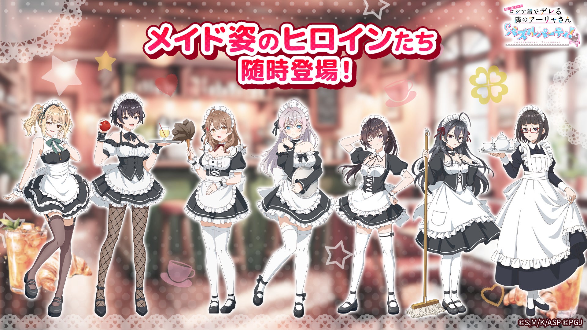 ポッピンゲームズジャパン株式会社(本社:東京都港区、代表取締役 CEO:谷口祐一郎)の開発・運営する、TVアニメ「時々ボソッとロシア語でデレる隣のアーリャさん」初のスマートフォン向けアプリゲーム『時々ボソッとロシア語でデレる隣のアーリャさん パズルパーティ!』(略称:ぱずでれ)では、2025年4月1日(火)より「開店!ぱずでれ喫茶室2025」を開催中です。イベント特効勧誘では、メイド姿の衣装を着たキャラクターが登場します。期間限定の勧誘や限定イベントをお楽しみください!