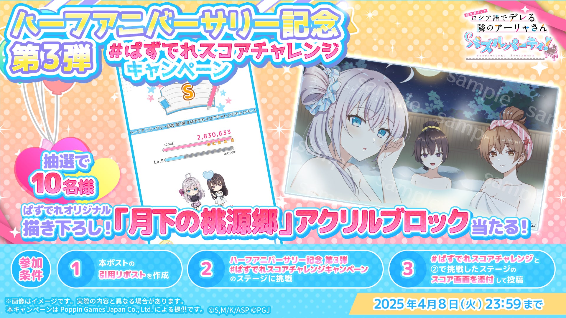 公式Xでは4月2日(水)より「ハーフアニバーサリー記念 第3弾 #ぱずでれスコアチャレンジ キャンペーン」を開催中です。ゲーム内で開催中の「ハーフアニバーサリー記念 第3弾 #ぱずでれスコアチャレンジ キャンペーン」のステージをプレイするキャンペーンです。