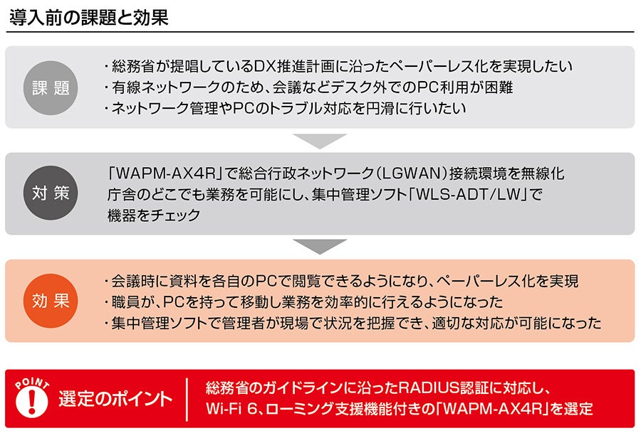 有線で使用していた総合行政ネットワーク(LGWAN)接続環境を無線化。庁舎内の自由移動で業務フットワークが軽くなり、ペーパーレス化も促進。