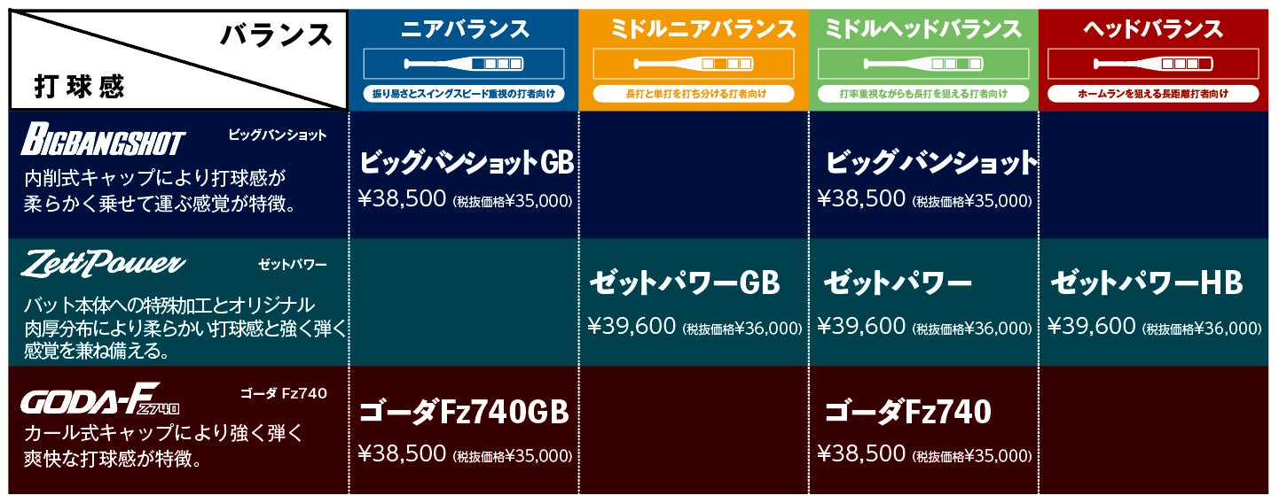 「ベースボールを科学する。」ゼット株式会社(本社/⼤阪市天王寺区、代表取締役社⻑/渡辺裕之)は、硬式⾼校野球⽤⾦属製バットの新基準仕様完全移⾏(2024年 第96回選抜⾼校野球⼤会、各都道府県春季⼤会〜)に向けて打球感・バランスに対する多様な打者ニーズに応える新基準対応7モデルを発売します。