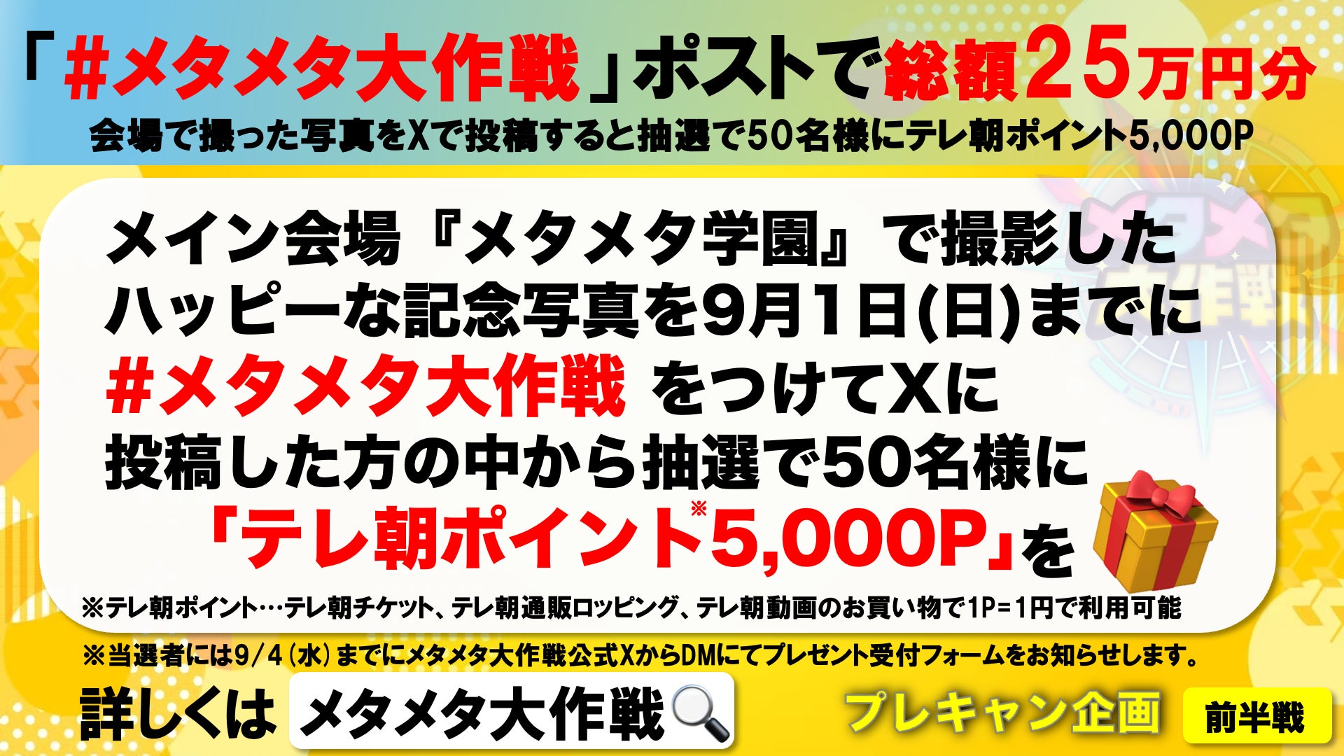 ※当選者には9月4日(水)までにメタメタ大作戦公式XからDMにて当選者用プレゼント受付フォームをお知らせします。9月11日(水)までに受付が完了した方に「テレ朝ポイント(期間限定P)5,000P」をプレゼントします。期間限定Pはテレ朝チケット、テレ朝通販ロッピング、テレ朝動画のお買い物で1P=1円でご利用いただけます。