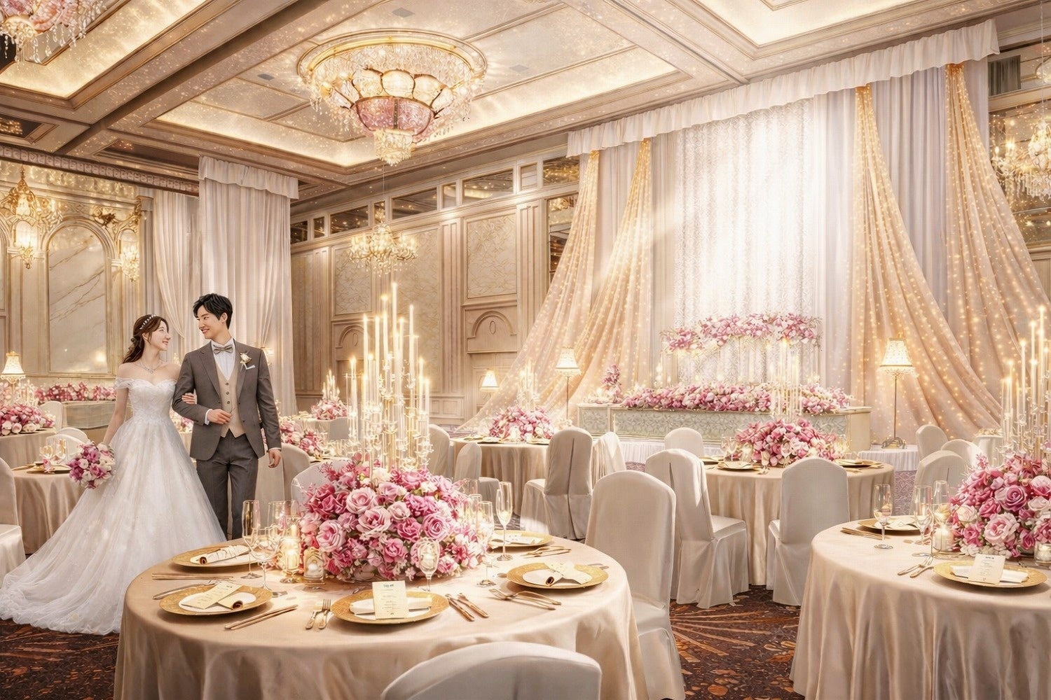 さらに、刺繍レースのドレープやオーガンジーのシアー素材、LEDイルミネーションを組み合わせることで、クラシカルな美しさと現代的な輝きを調和。柔らかな光に包まれる空間が、まるでドレスアップするかのような高揚感を生み出し、ゲストの期待感を自然と高めます。