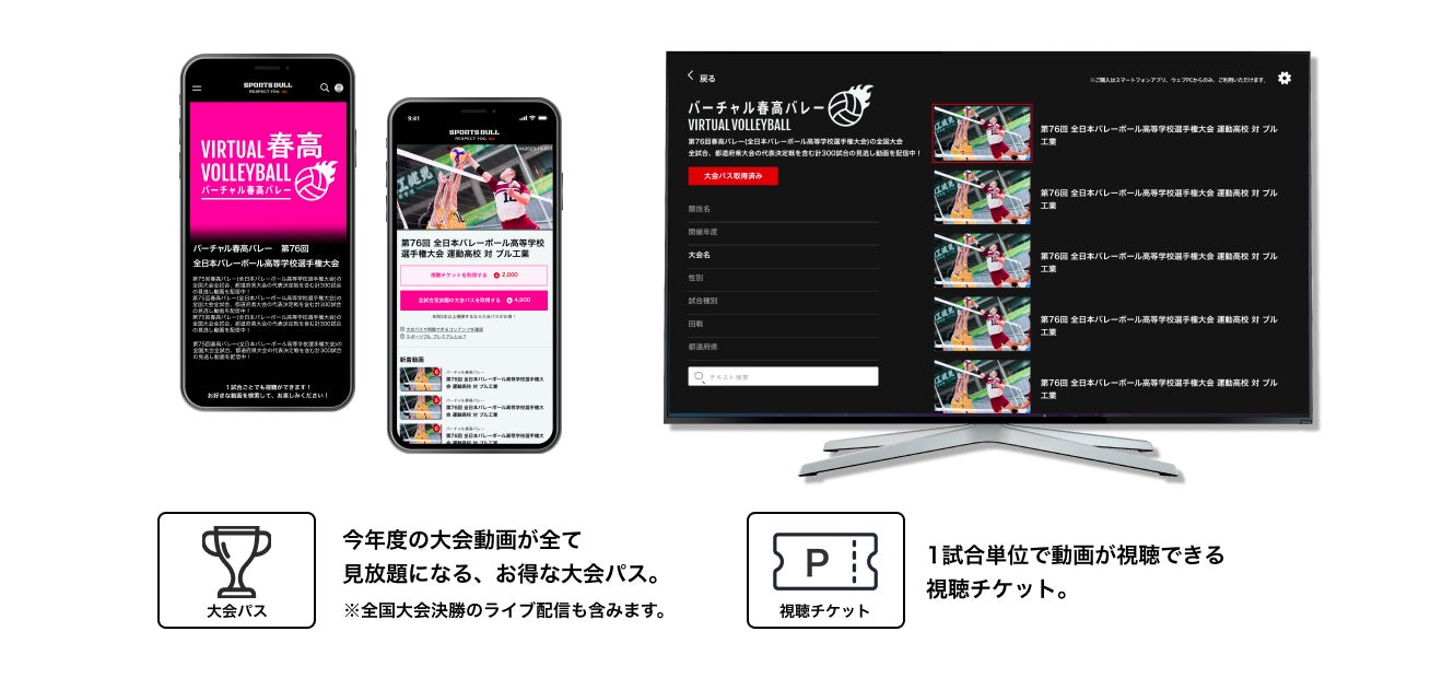 今年も各都道府県大会と全国大会の試合映像を見逃し配信として販売します。見逃し配信をご利用いただくことで、観たい試合をいつでもどこでも視聴することが可能です。SPORTS BULLから購入ができ、1試合単位での購入(2,000円)または、大会パスとして全試合の購入(4,900円)の2種類から選択可能です。