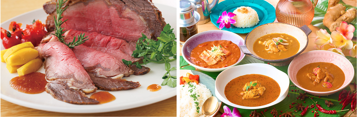 右:夏と言えばやっぱりカレー!と言ってもホテルレオマの森のカレーは一味違います。四国の食材を使用したメニューのご提供を心掛けているため、4種類のカレーにもそれぞれに四国の食材を使用。「讃岐いりこ出汁のスープカレー」は、手打ちうどんでと一緒に食べるのもお薦めです。