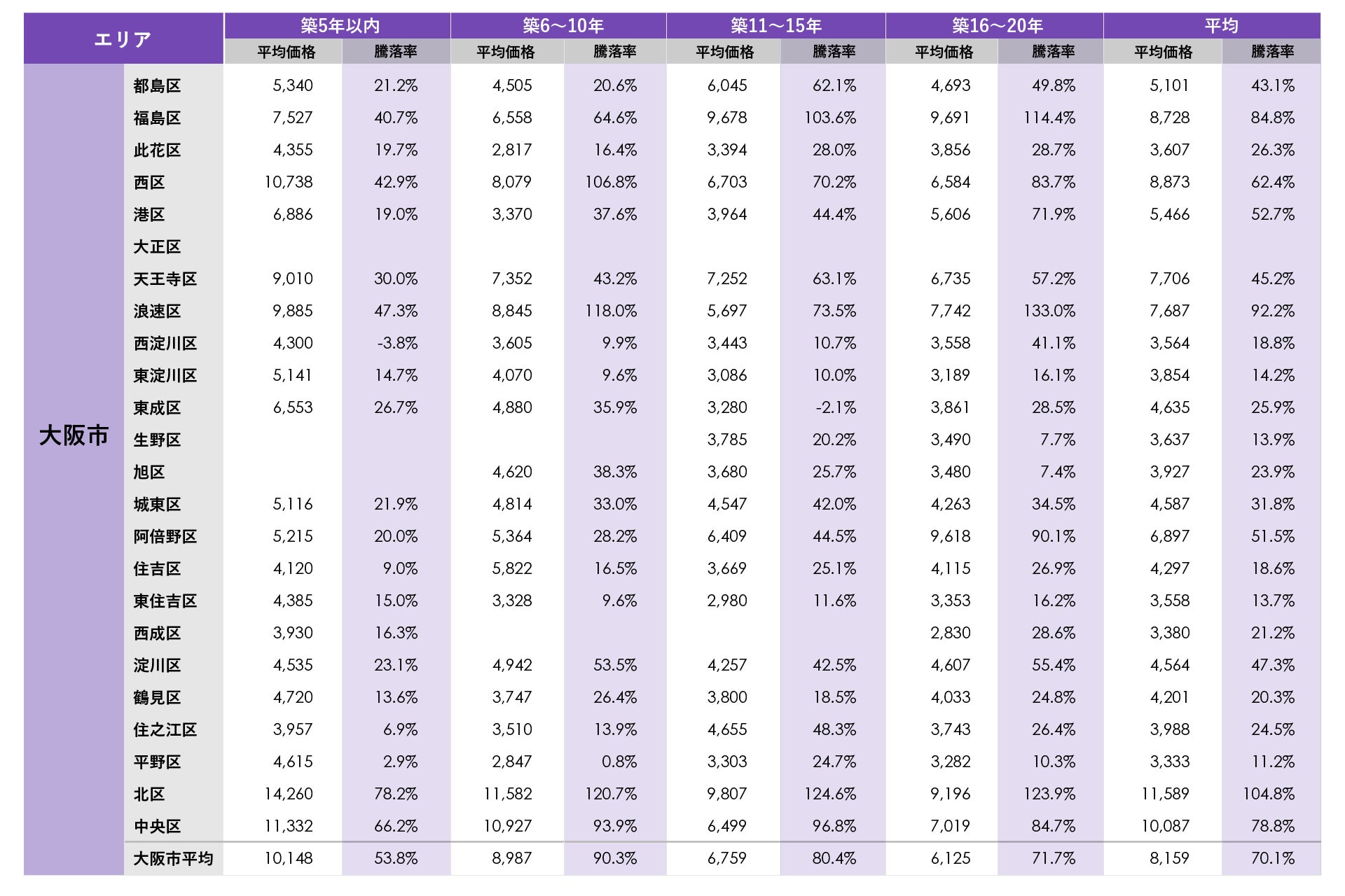 大阪市で平均価格が最も高かったのは北区の1億1,589万円、次いで中央区の1億87万円で、この2区の平均価格が1億円を上回りました。平均騰落率も北区が新築分譲時プラス104.8%で最も高くなりました。築年別では、福島区の築11~15年と築16~20年、西区の築6~10年、浪速区の築6~10年と築16~20年、北区の築6~10年と築11~15年、築16~20年で平均騰落率がプラス100%を上回りました。梅田周辺から難波周辺までのエリアのタワーマンション騰落率が突出していることが要因となっています。
