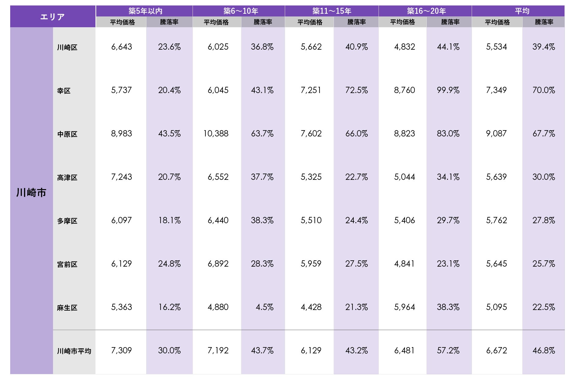 川崎市では、タワーマンションが林立する武蔵小杉のある中原区が前期に引き続き平均価格9,087万円で最も高く市内でも突出しています。平均騰落率は幸区が最も高く新築分譲時プラス70.0%でした。築年別では幸区の築16~20年が平均騰落率プラス99.9%で突出しています。前期に引き続き、川崎駅の駅近大規模タワーマンションの価格騰落率が突出していることが要因となっています。