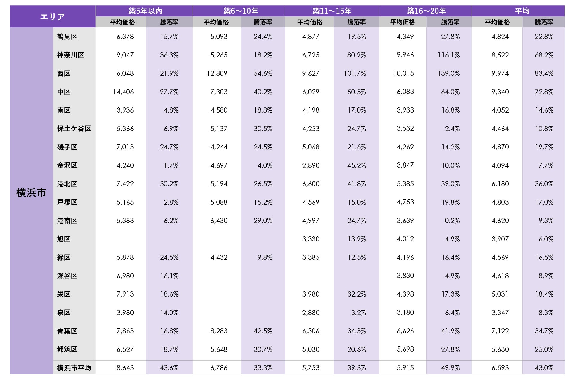 横浜市では、西区と中区の平均価格が9,000万円を上回りました。平均騰落率も西区が最も高く新築分譲時プラス83.4%、次いで中区がプラス72.8%で、この2区が横浜市でプラス70%を上回りました。西区の築6~10年と築16~20年、中区の築5年以内では平均価格が1億円を上回りました。平均騰落率では神奈川区の築16~20年と西区の築11~15年、築16~20年で平均騰落率がプラス100%を超えました。前期に引き続き、みなとみらい地区をはじめとする沿岸部のタワーマンションが騰落率を引き上げる要因になっています。