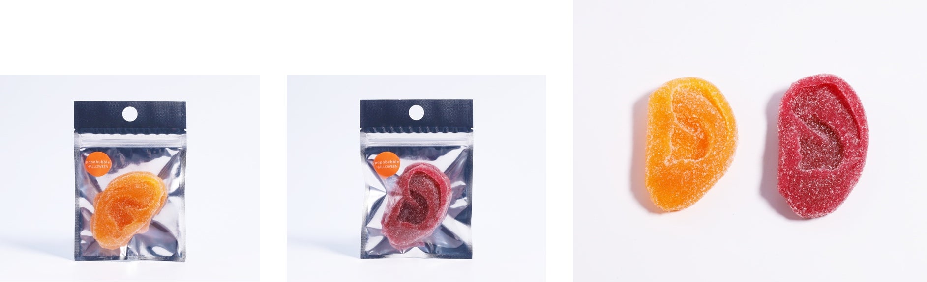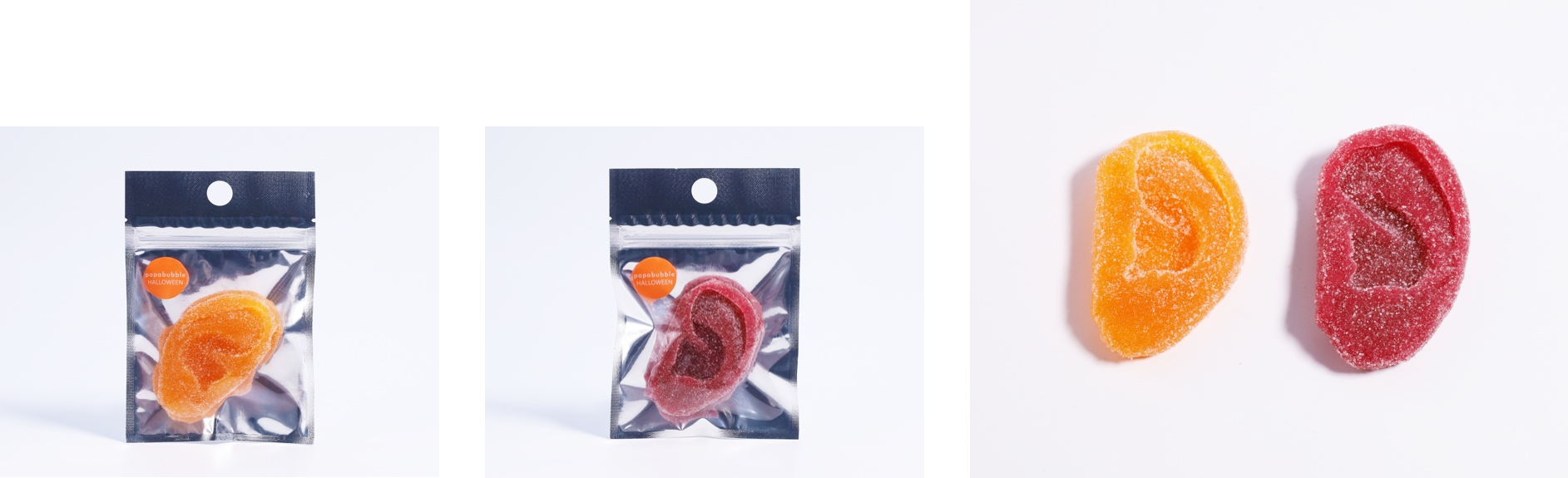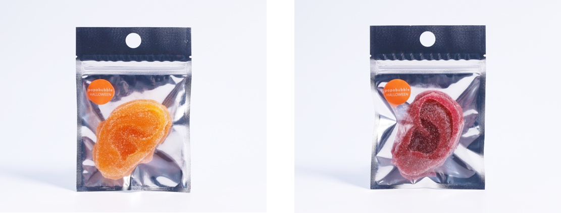6年ぶりに再登場の、原寸大「耳」型グミです。今年はリアルな質感にこだわり、ハードタイプの固いグミでご用意しました。フレーバーは爽やかなパッションオレンジと、酸味が効いたラズベリーフレーバー。ハロウィンパーティーにプレゼントで持っていくと、みんながドキッとすること間違いなしです。