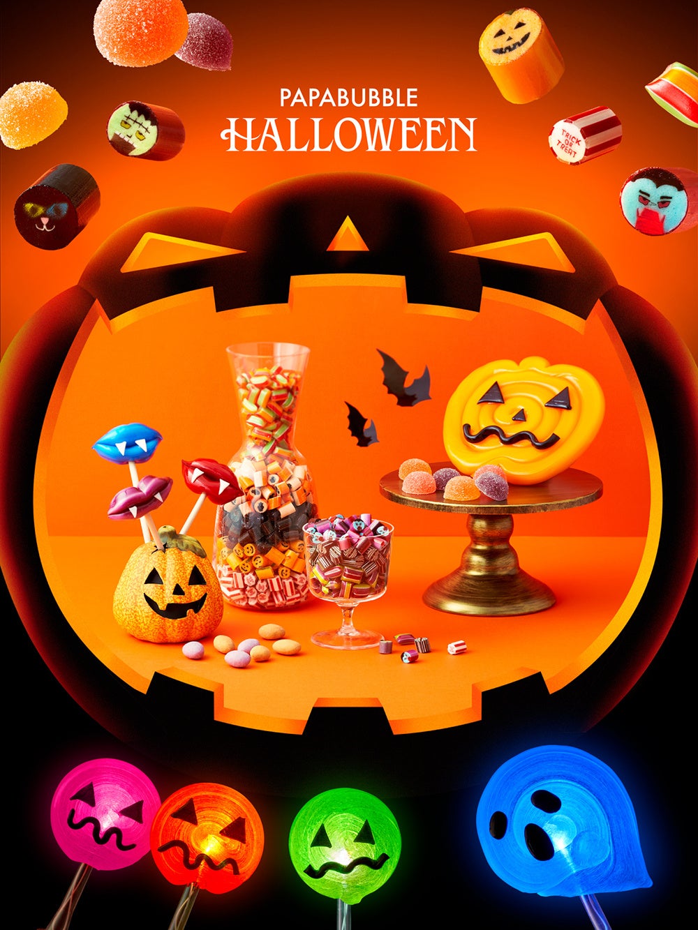 今年のパパブブレのハロウィンは「光る」がテーマ。光に透かすと目が浮かび上がる猫やモンスターのキャンディや、光る棒付きのロリポップなど、ポップで楽しい仕掛けが施されています。